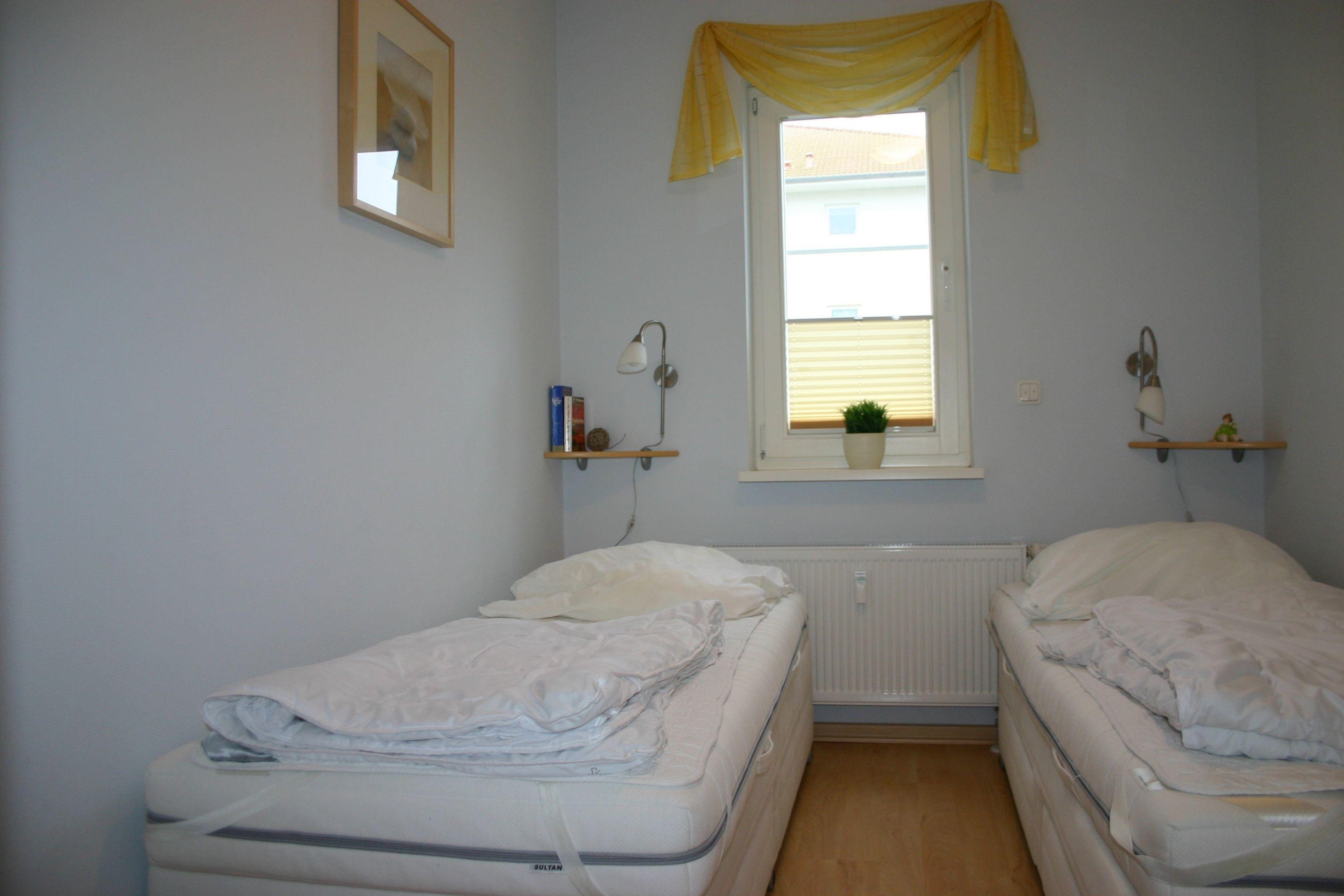 Das Schlafzimmer ist ausgestattet mit einem Doppelbett und TV. Das zweite Schlafzimmer verfügt über 2 Einzelbetten. Ein Duschbad/WC ergänzt die Ferienwohnung.