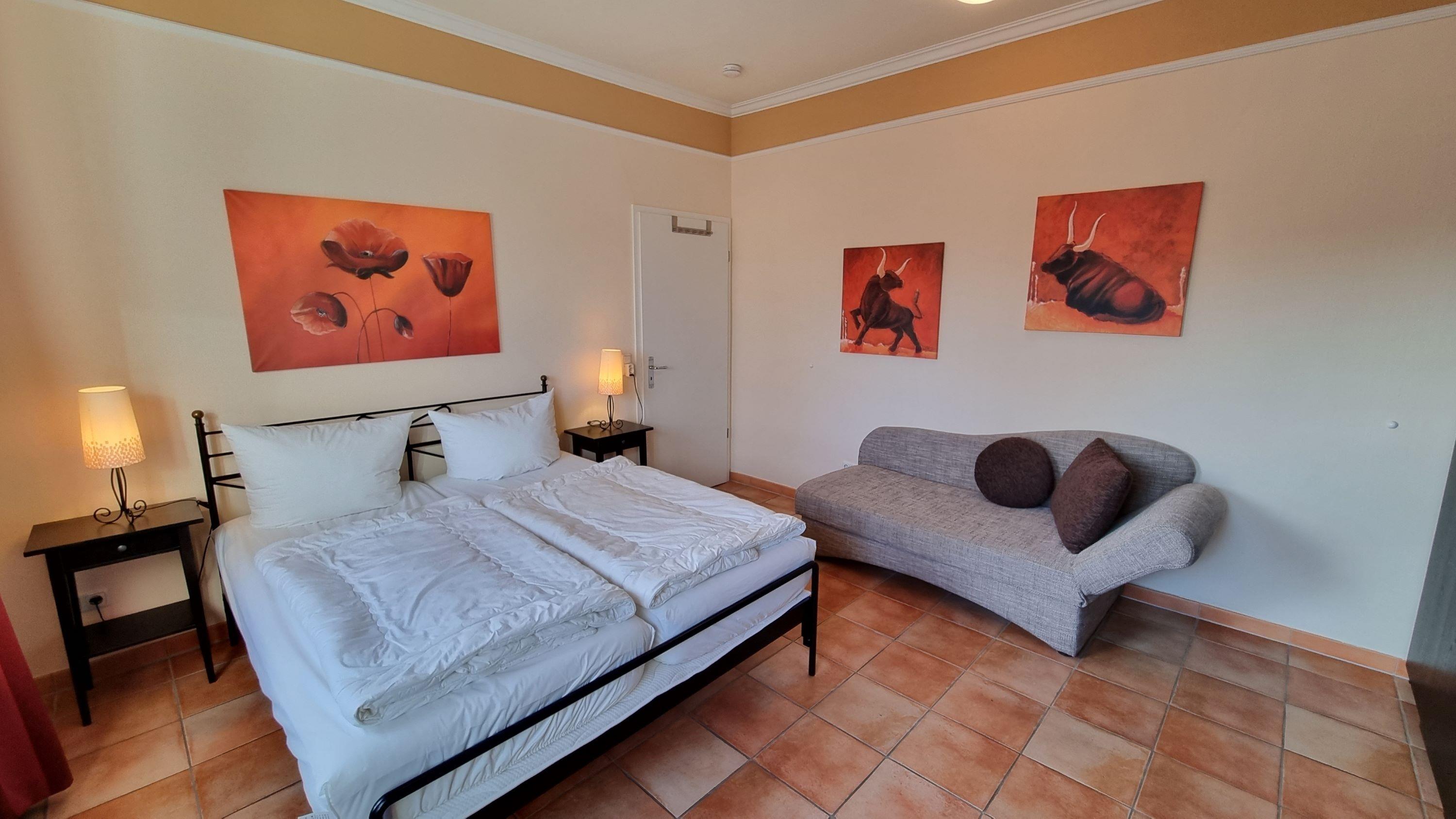 Das Schlafzimmer verfügt über ein Doppelbett und zur Ablage viel Platz in den Kleiderschränken. Zusätzlich befindet sich im Schlafzimmer eine Schlafliege bzw. Sofa.
