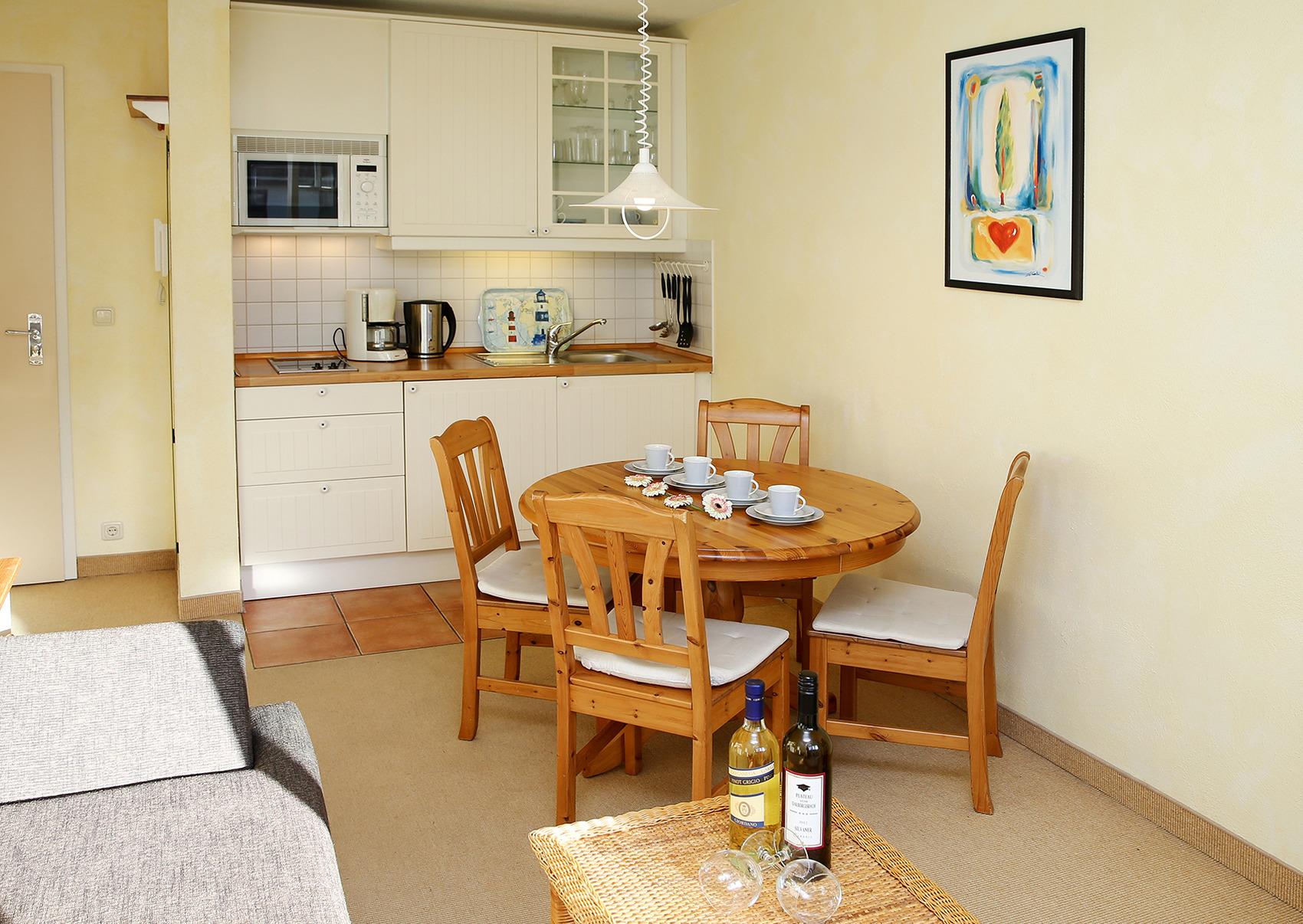 Im Wohnbereich ist eine Pantryküche integriert. Ein Bad/WC mit Dusche ergänzt die Ferienwohnung.