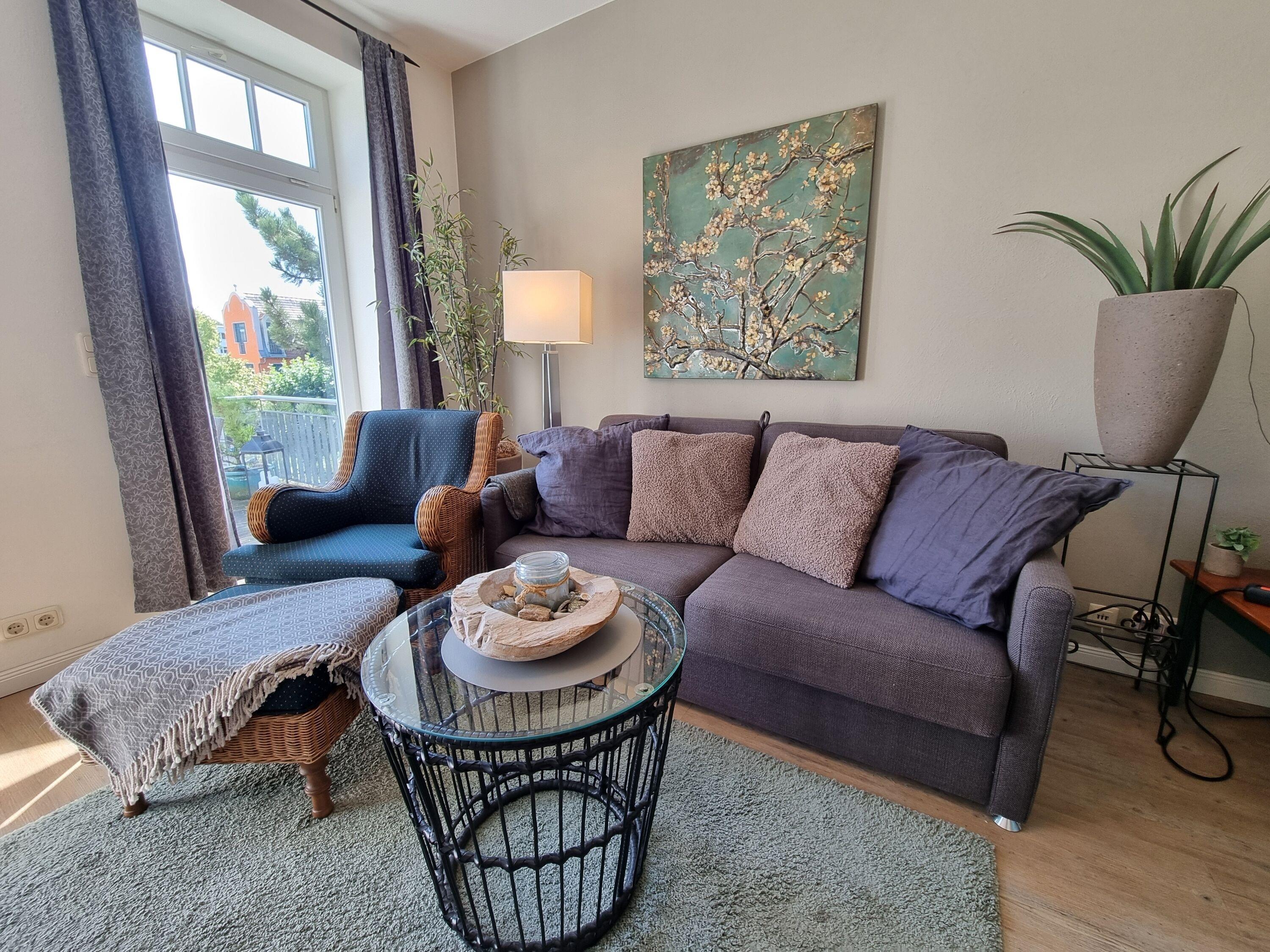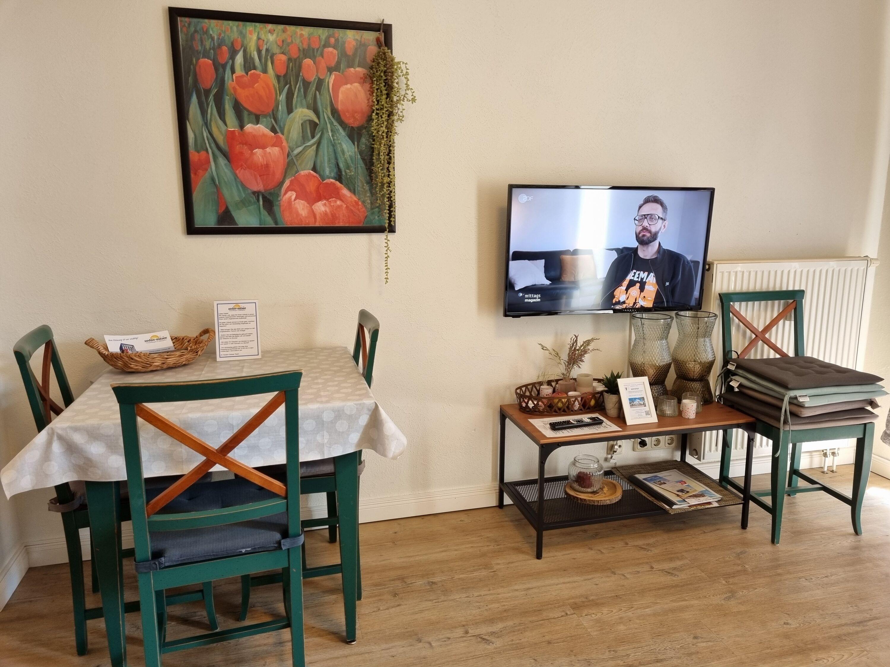 Hell und freundlich eingerichtet bietet die Wohnung einen Wohnbereich mit Sitzgruppe (inkl. Schlafcouch), TV und Hifi-Anlage.