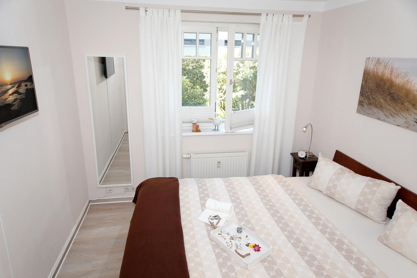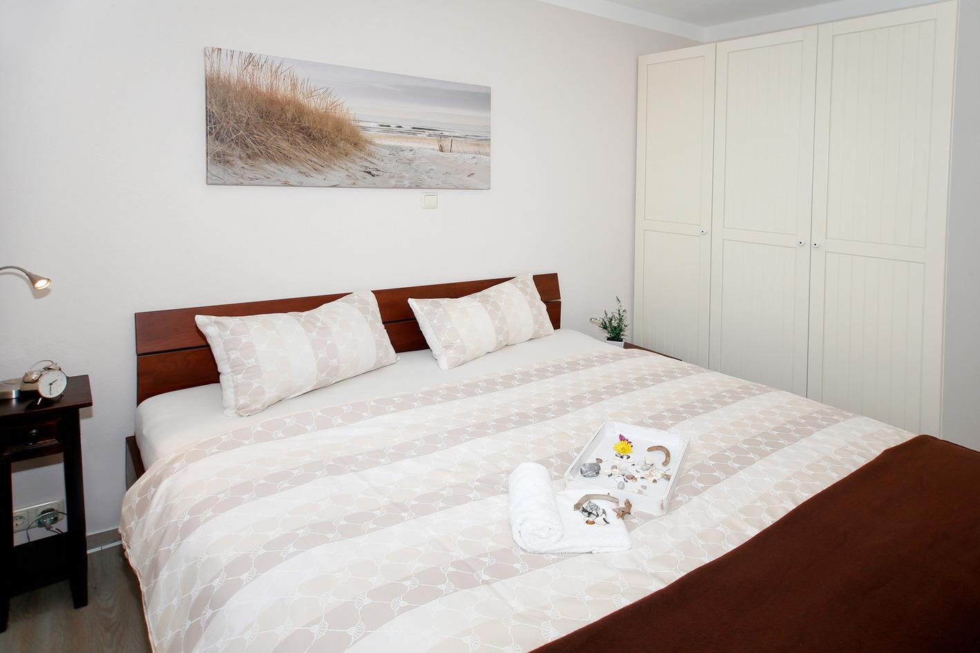 Das Schlafzimmer mit Doppelbett bietet 2 Schlafmöglichkeiten. Der Wohnbereich ist