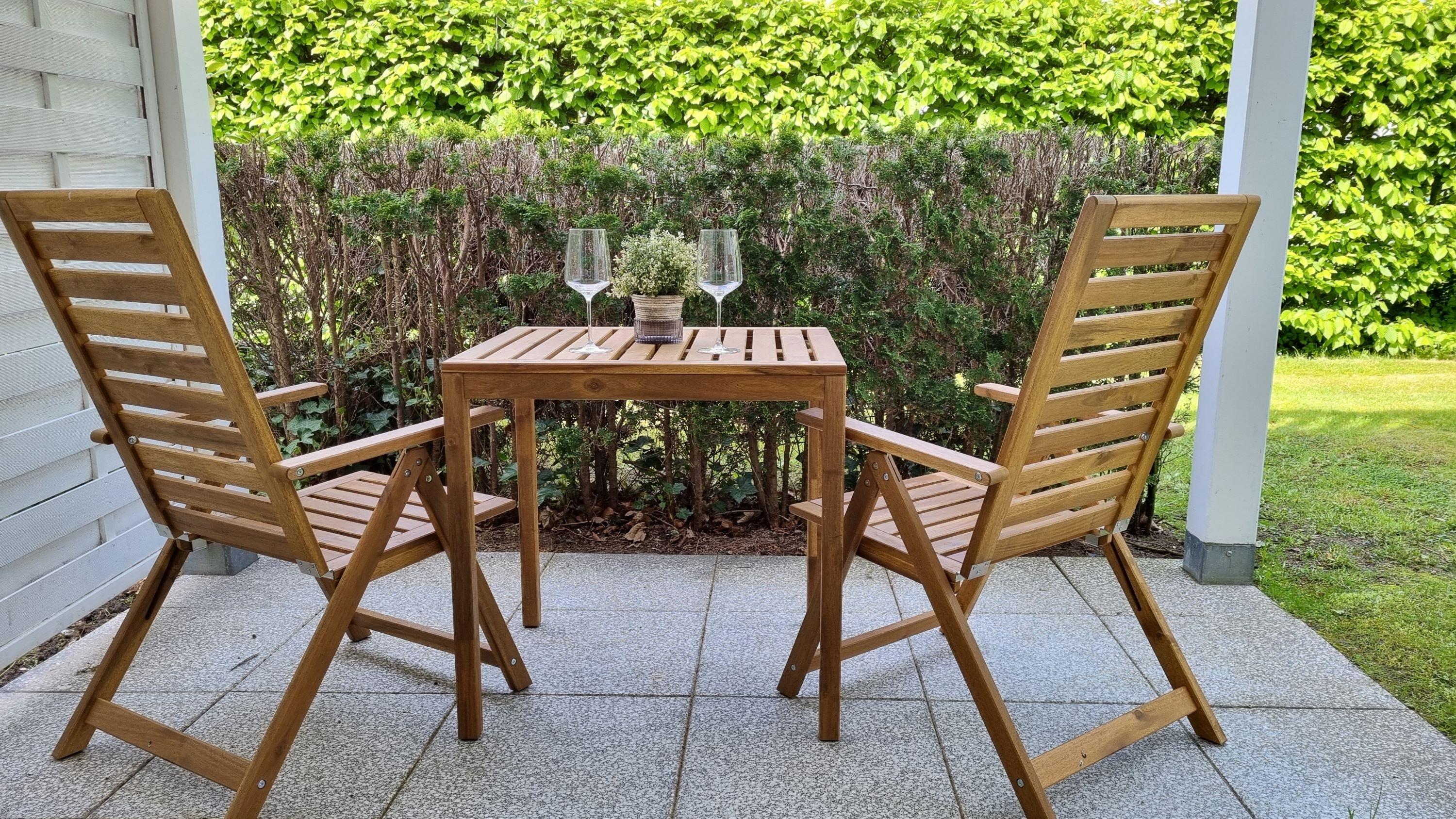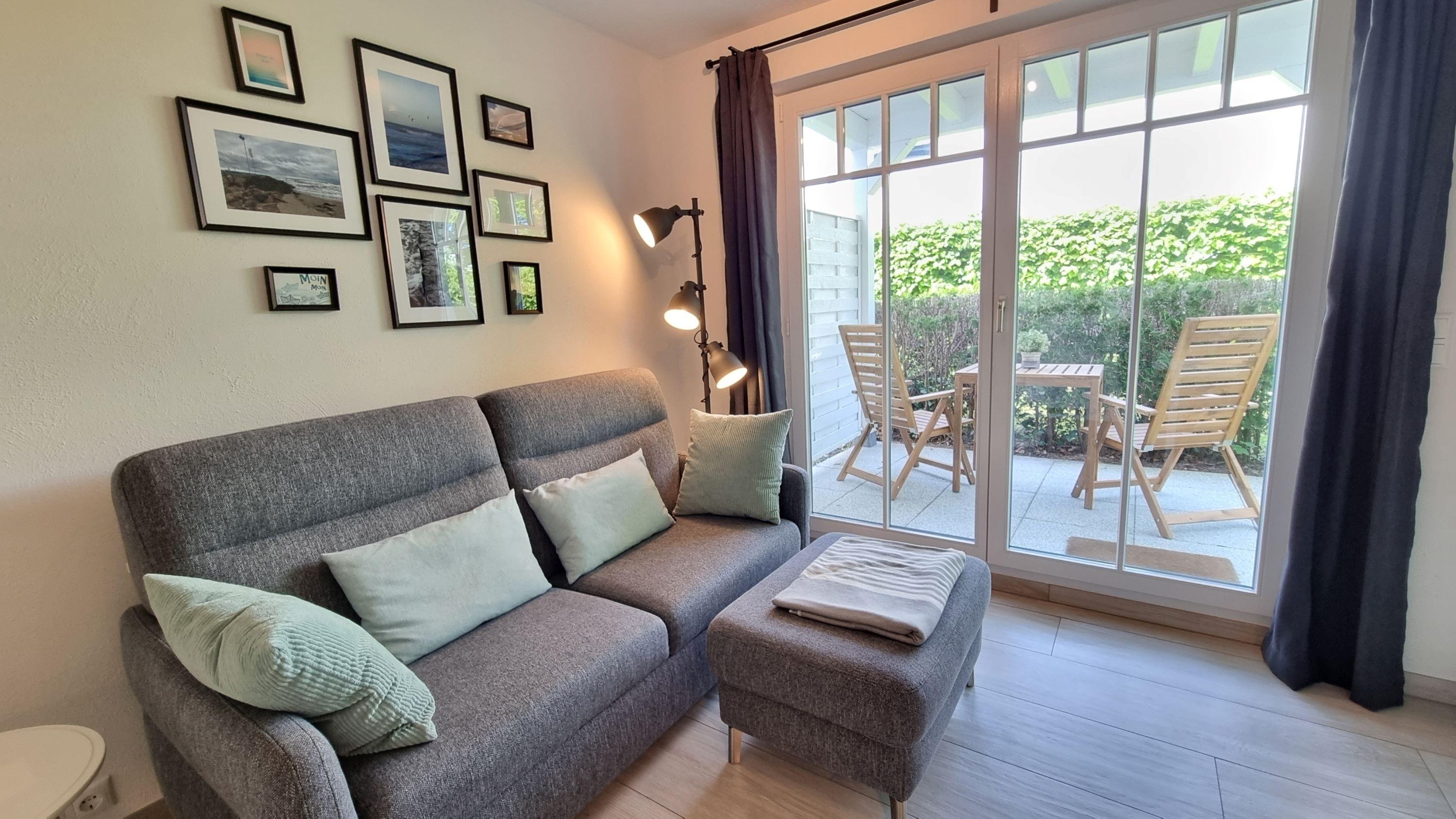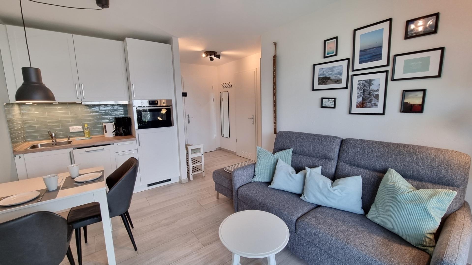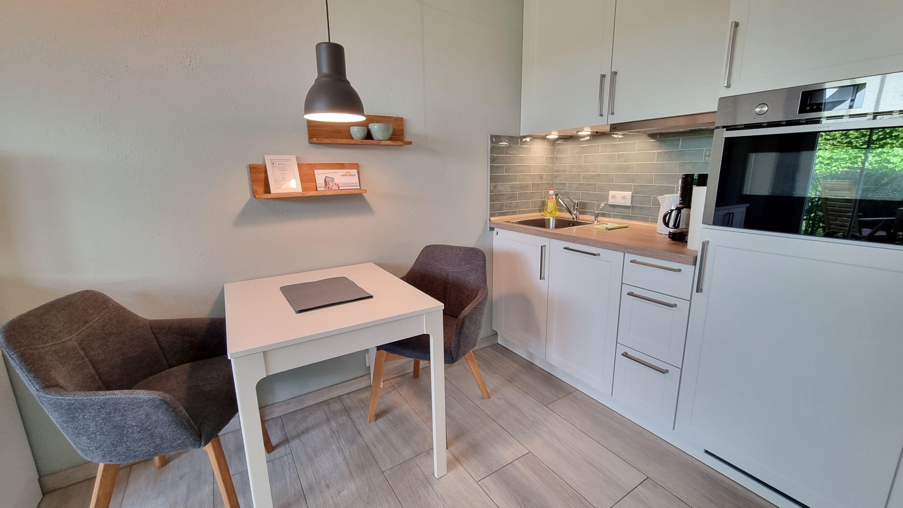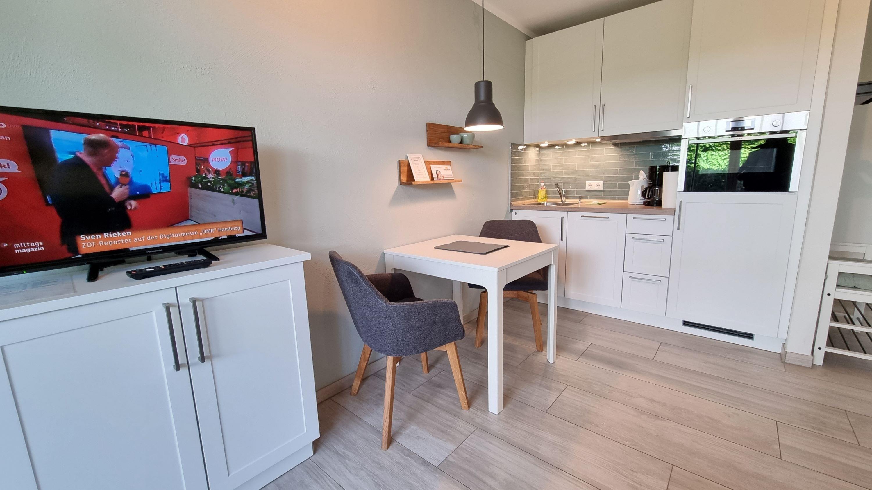 Der Wohnbereich ist mit einem sehr bequemen Sofa (Doppelschlafcouch) und ausziehbarem Esstisch eingerichtet. Zur technischen Ausstattung gehören 2 x TV (Wohnzimmer und Schlafzimmer) und es steht Ihnen ein kostenfreier W-LAN Zugang zur Verfügung (schneller Glasfaseranschluss). Im Wohnbereich ist eine Pantryküche mit Kühlschrank und Gefrierfach, Geschirrspüler, separatem Induktionskochfeld, Dunstabzugshaube, Kombigerät Backofen/Mikrowelle, Toaster, Wasserkocher und Kaffeemaschine integriert. Ein neues Bad/WC mit Dusche, Handtuchheizkörper und Haarfön ergänzt die Ferienwohnung. Die Wohnung verfügt über eine überdachte Terrasse mit Tisch und 4 Stühlen zur Westseite und lädt zum Entspannen ein.