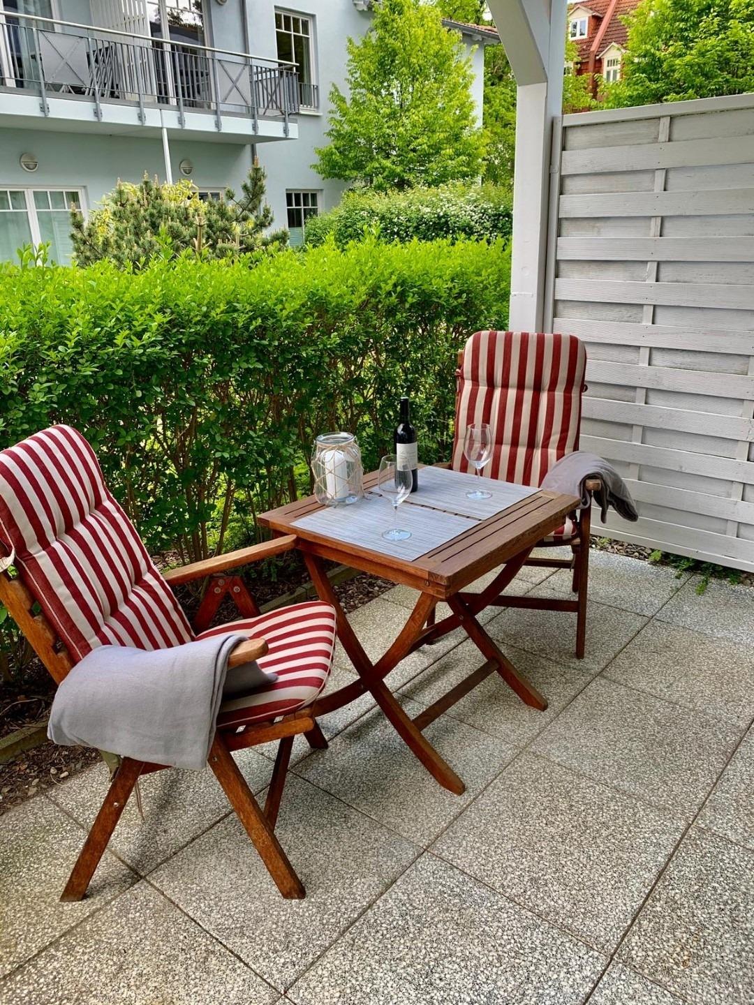 Ferienwohnung in Kühlungsborn für 2-3 Personen mit einer Terrasse auf der man in der Sonne frühstücken kann.