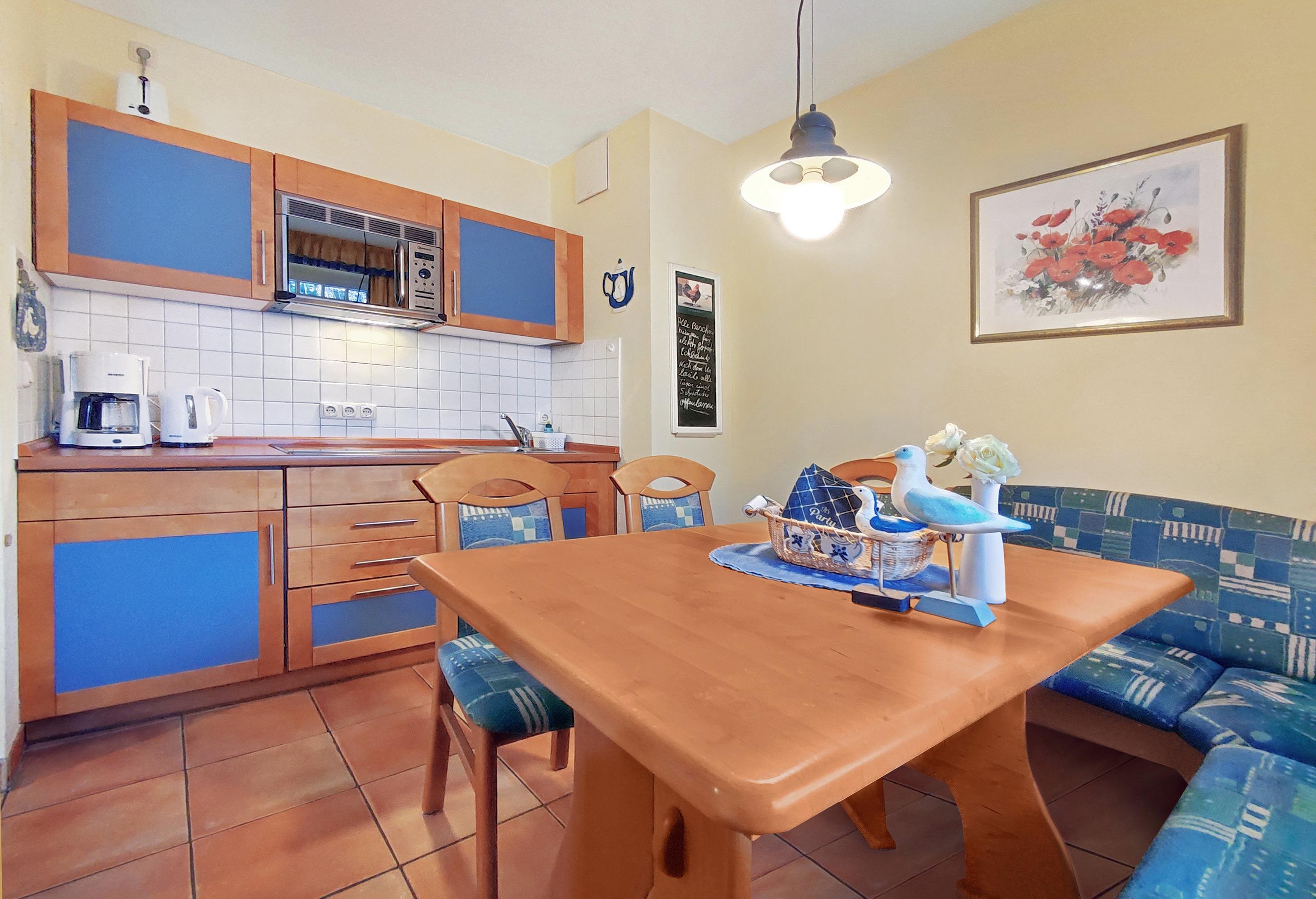 In der Küche mit gemütlicher Sitzecke und einer Küchenzeile mit einem 4-Platten Ceran Feld, können Sie sich für Ihre Ausflüge stärken.