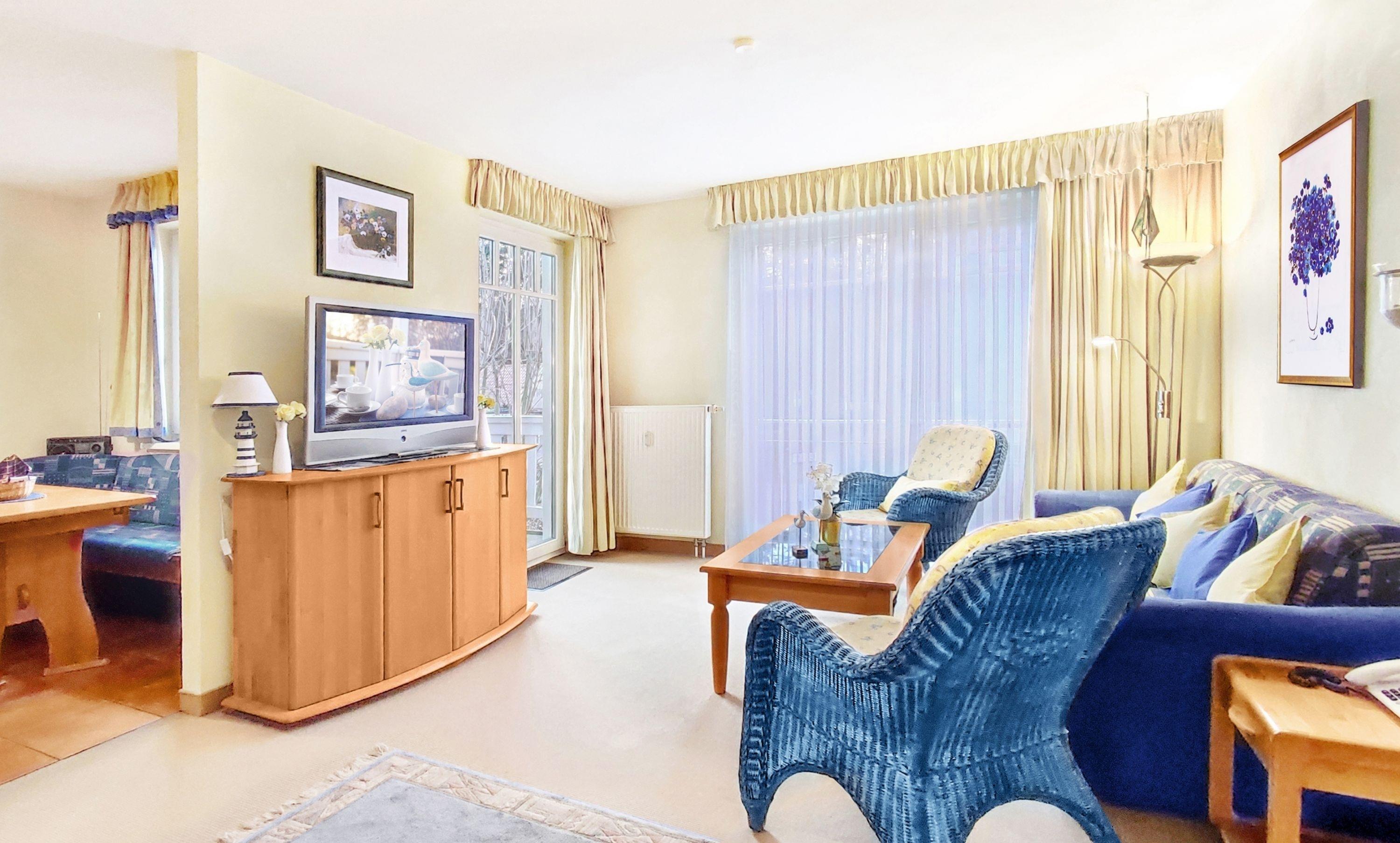 Der Wohnbereich ist mit einer Sitzgruppe ausgestattet und verfügt über den Zugang zu einem der beiden Balkone, welcher der größere der Beiden ist und zur Süd-Seite liegt.