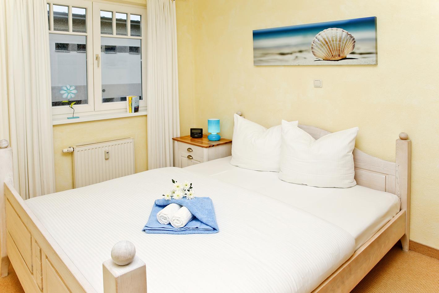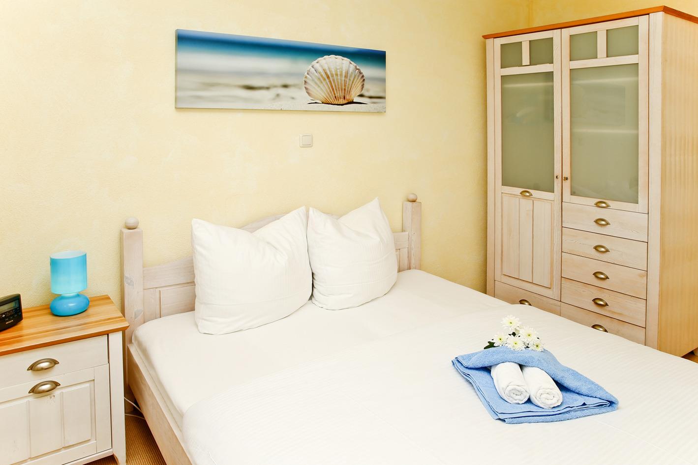 Im Schlafzimmer befindet sich ein Doppelbett. Das Duschbad/WC rundet die gemütliche Ferienwohnung ab. Der Balkon lädt zum Verweilen ein.