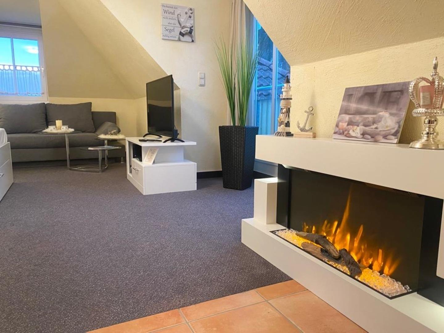 Ein großer, moderner E-Kamin rundet, insbesondere in den kalten Monaten, Ihre Urlaubsabende ab.