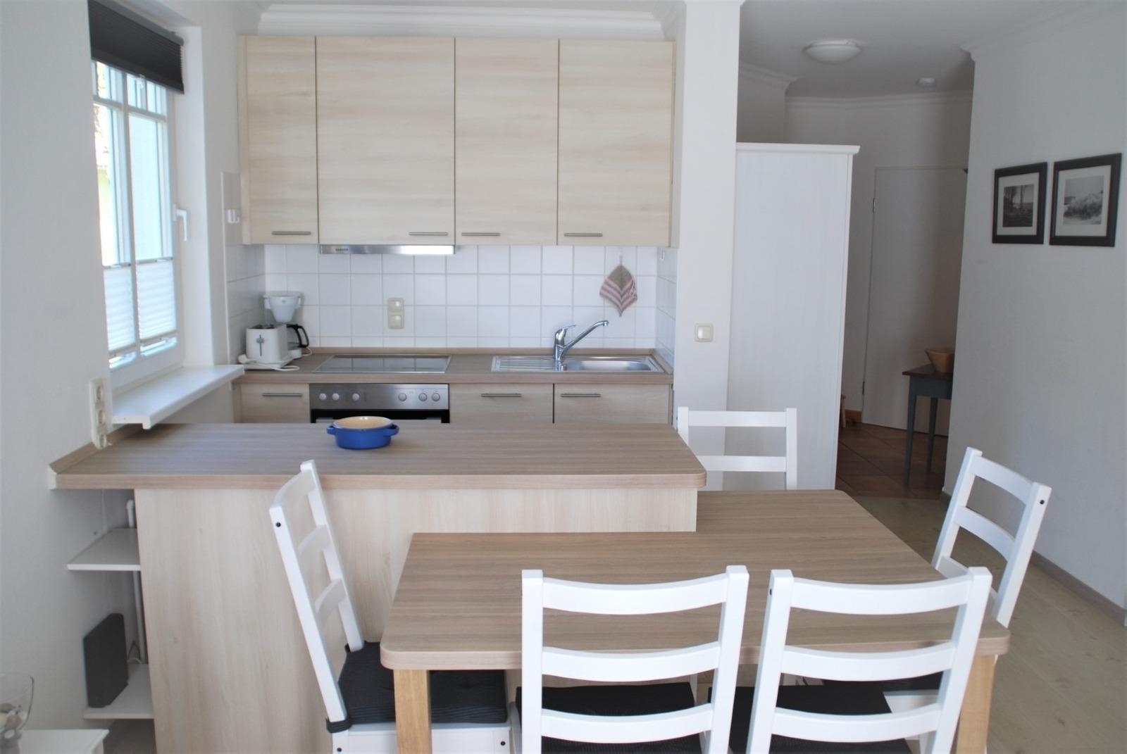 Die Pantry besteht u.a. aus einem Herd mit Ceranfeld und Backofen, auch ein Geschirrspüler ist vorhanden. Der Esstisch befindet sich an einer Kücheninsel.