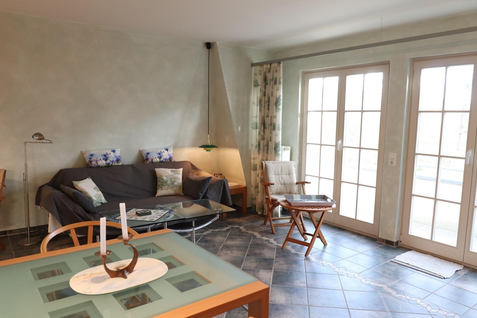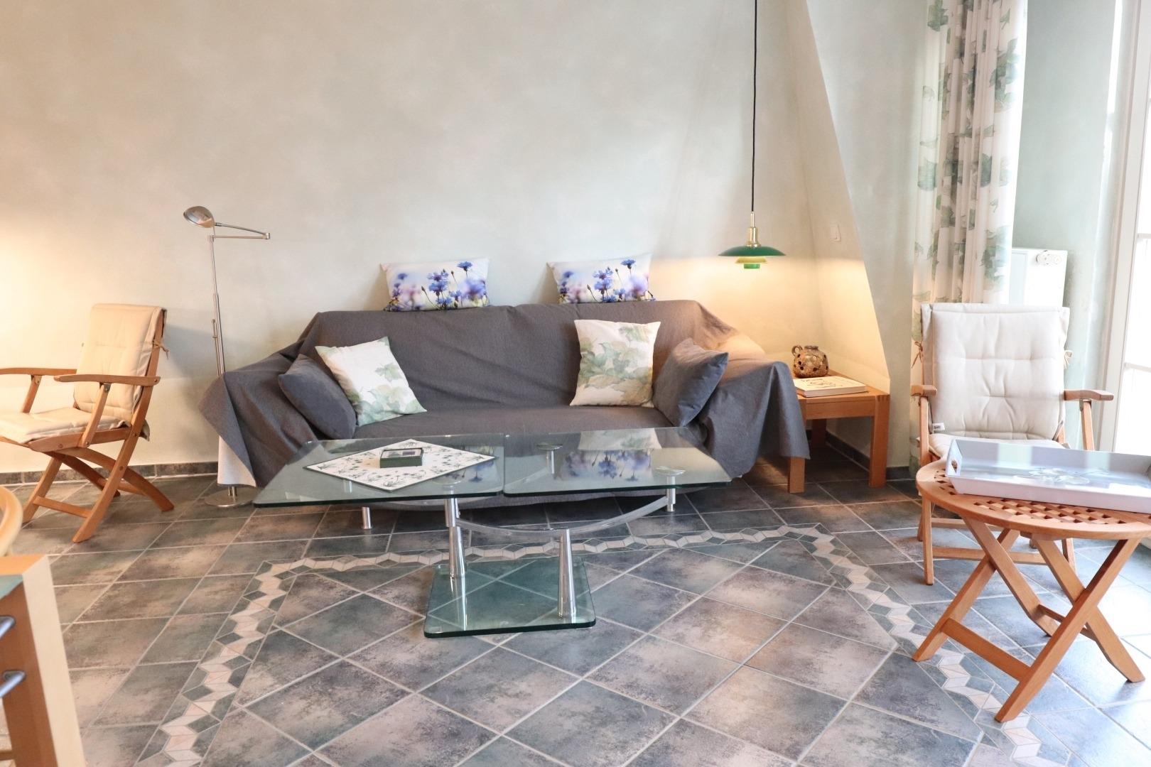 Eingerichtet ist die Ferienwohnung mit einem Schlafzimmer mit Doppelbett und einem Duschbad/WC. Im Wohnbereich finden Sie eine Couch, Esstisch und eine Einbauküche.