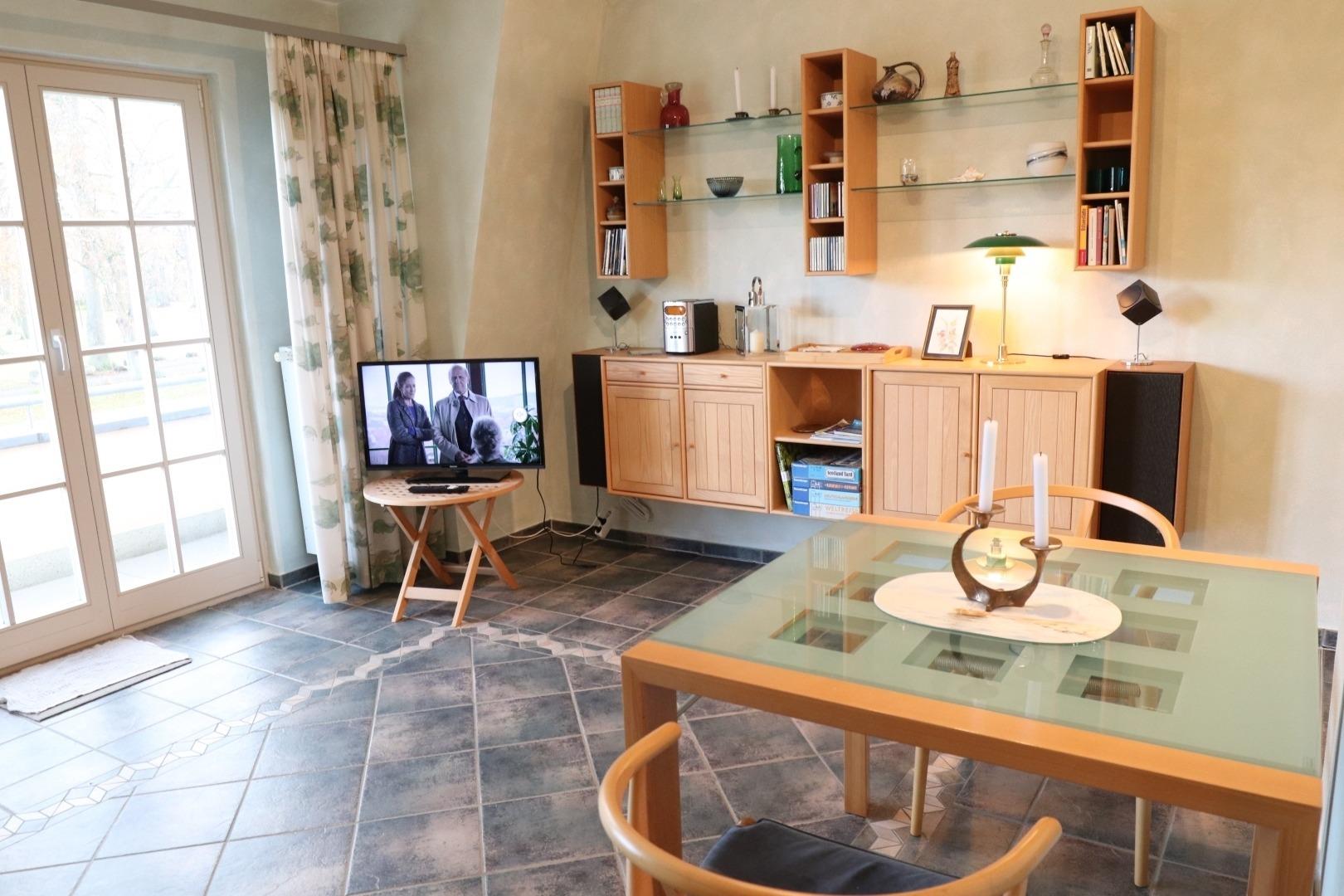Zur technischen Ausrüstung gehören Farb-TV und Hifi-Anlage.