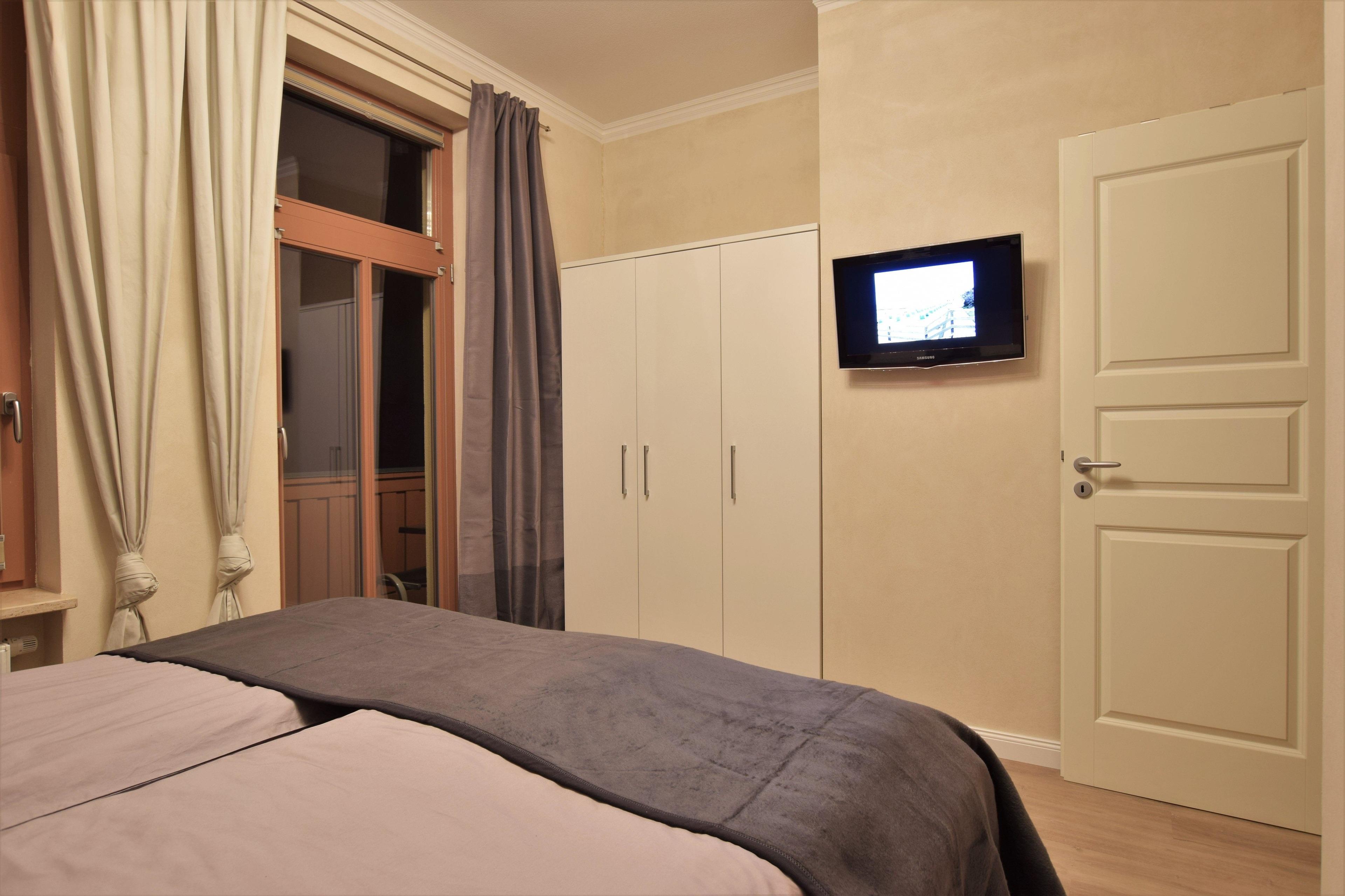 Das Schlafzimmer verfügt über ein gemütliches Boxspringbett in Komforthöhe und bietet Ihnen höchsten Schlafkomfort. Ein geräumiger Kleiderschrank und einen zweiten Fernseher finden Sie hier ebenfalls vor. Von diesem Raum können Sie ebenfalls den Balkon betreten.
