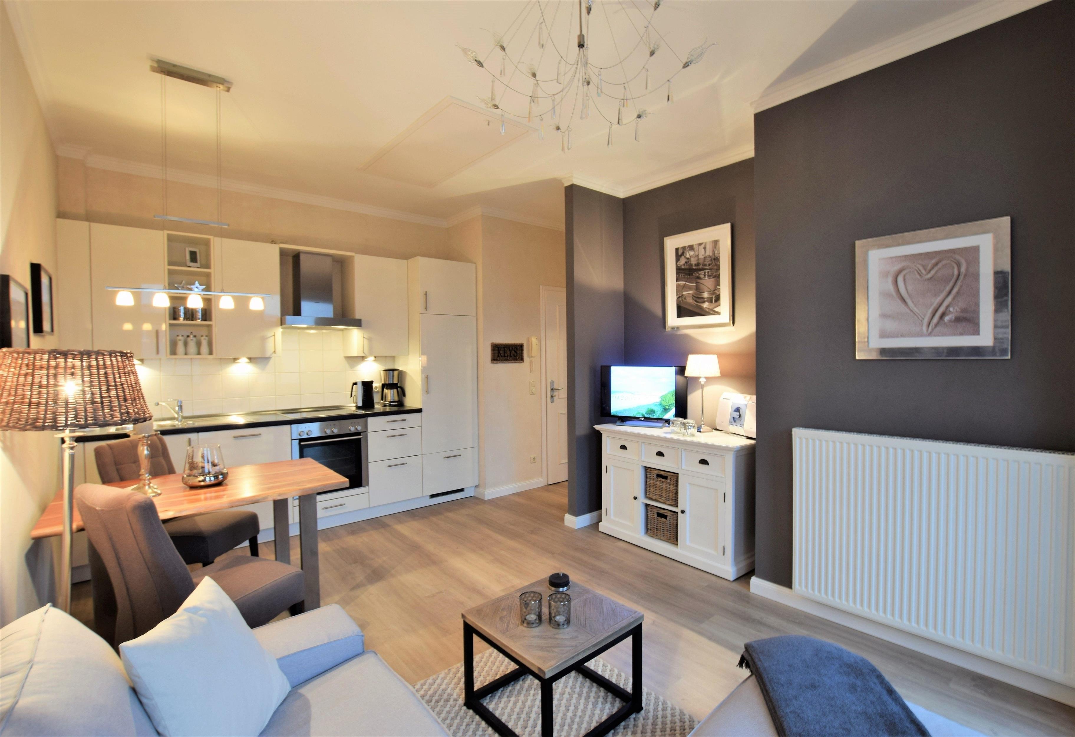 Der Fußboden ist mit einem hochwertigen Design-Bodenbelag ausgelegt. Durch die hohen Fensterfronten wirken die Räume hell und freundlich. Eine geschmackvolle Ausstattung und liebevolle Gestaltung der Wohnung sorgen für Gemütlichkeit und einen erholsamen Urlaub. Sie werden sich sofort wohlfühlen und unbeschwerte Urlaubstage verbringen!