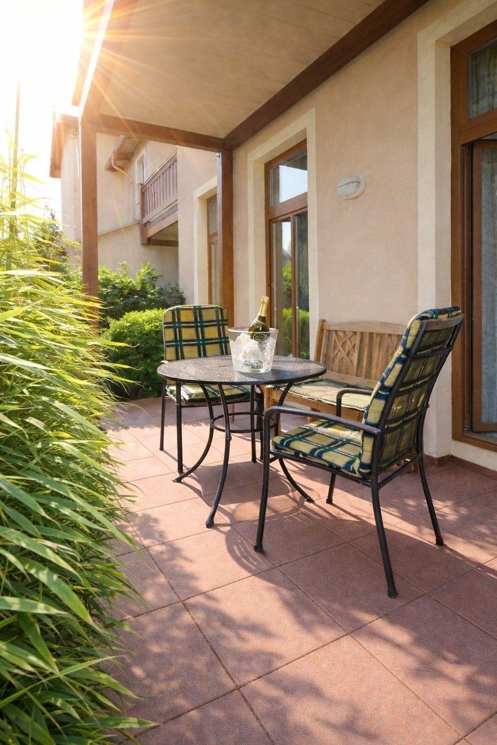 Ihre Auszeit beginnt auf der ruhig gelegenen Süd-/Ost-Terrasse, auf der Sie Ihr Frühstück in der Morgensonne genießen können. Die Terrasse ist mit einer Holzbank und Gartenstühlen ausgestattet. Freuen Sie sich auf ein paar unbeschwerte Stunden mit der Familie im Außenbereich der Wohnung.