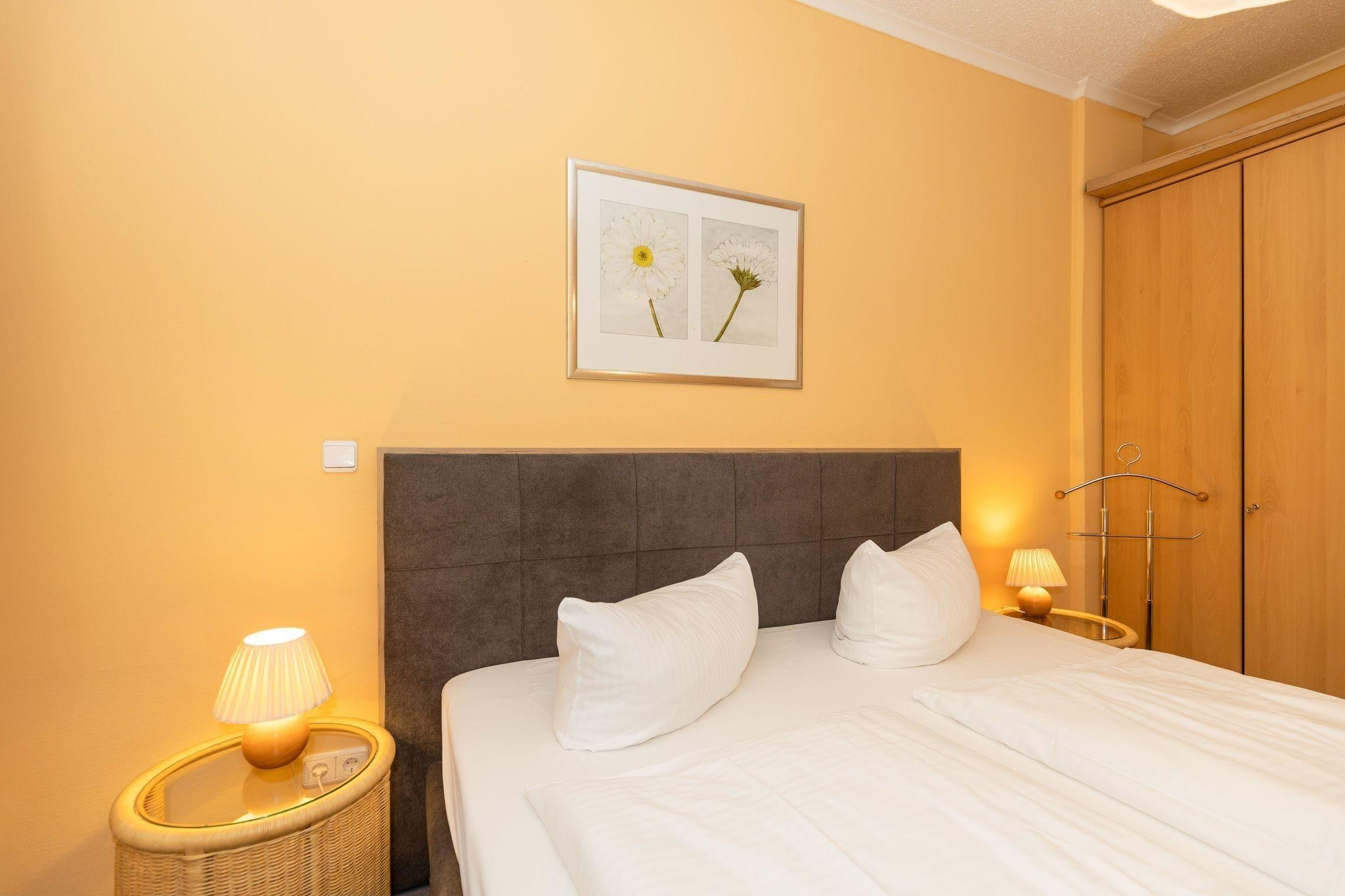 Im ersten Schlafzimmer finden Sie neben dem bequemen Doppelbett einen großen Einbaukleiderschrank. Ein Fernseher ist für das abendliche Fernsehen im Bett gut geeignet. Das in der Wohnung befindliche Babybett vom Typ Hauck findet hier bei Bedarf ebenfalls Platz.