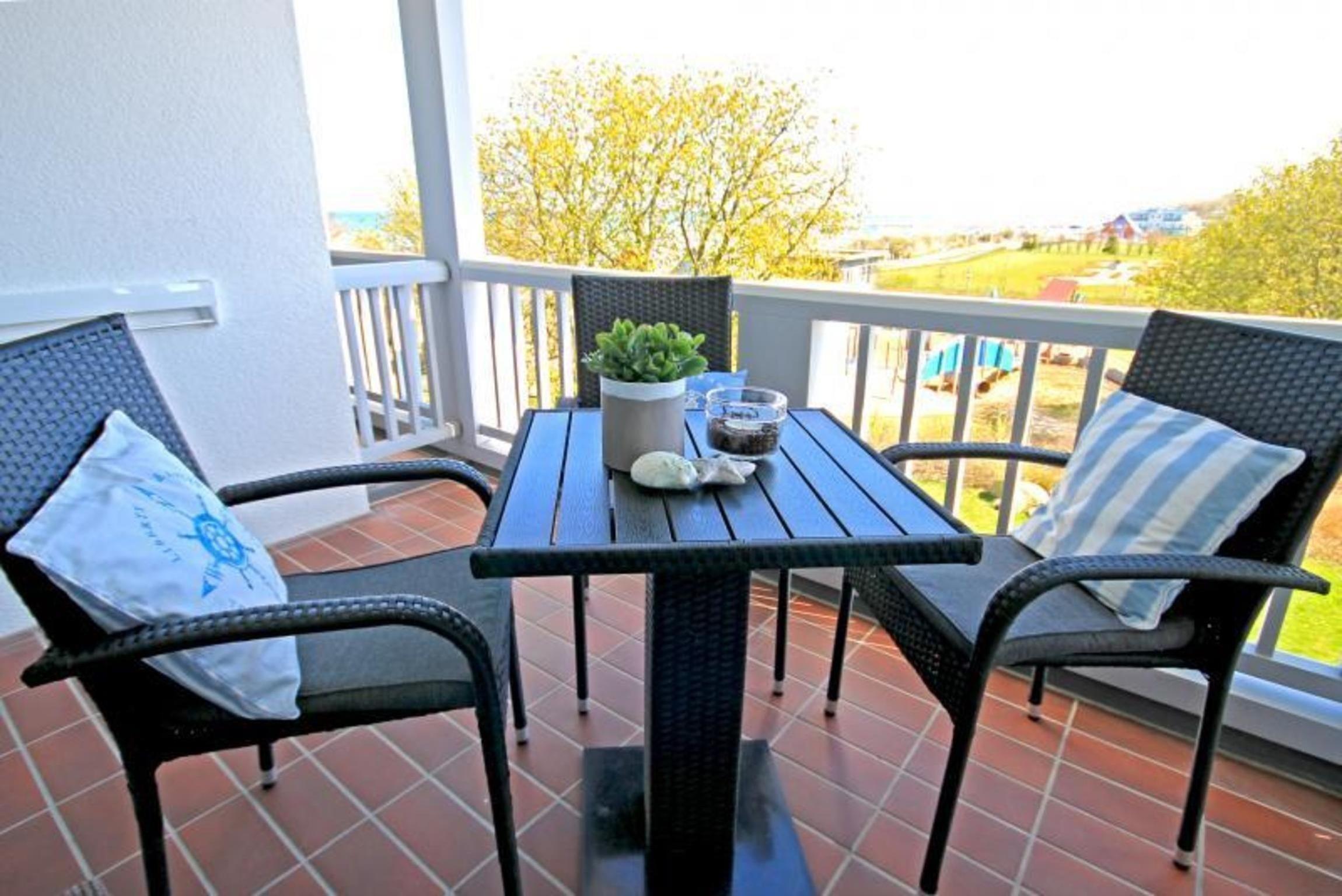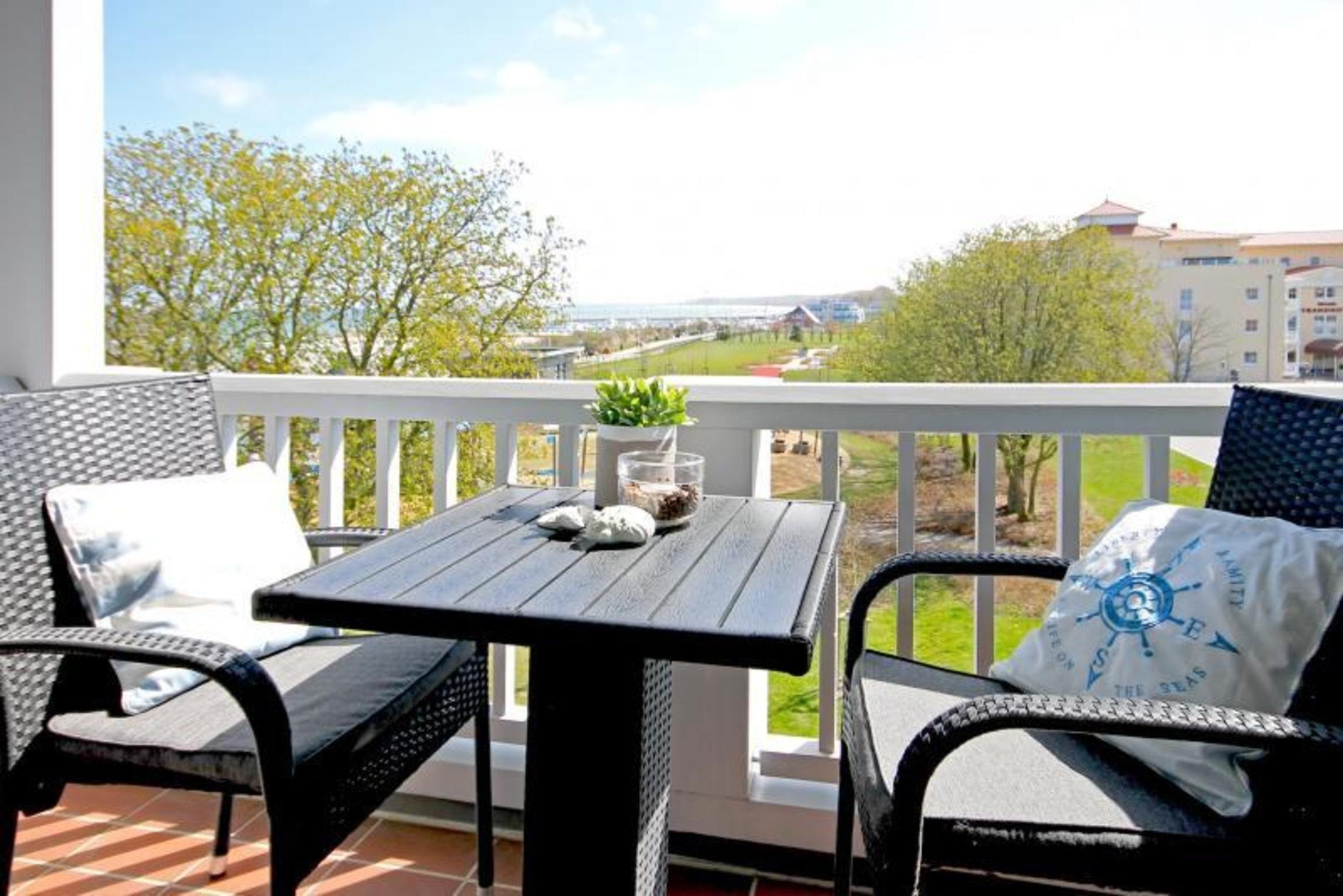 Lassen Sie sich dabei von den Sonnenstrahlen bis Mittag verwöhnen und die Seele baumeln beim Blick auf die Ostsee, den Yachthafen von Kühlungsborn und bei klarer Sicht bis hinüber zur "Weißen Stadt" Heiligendamm und weiter. Ihnen stehen 4 Balkonstühle und 1 Tisch zur Verfügung.