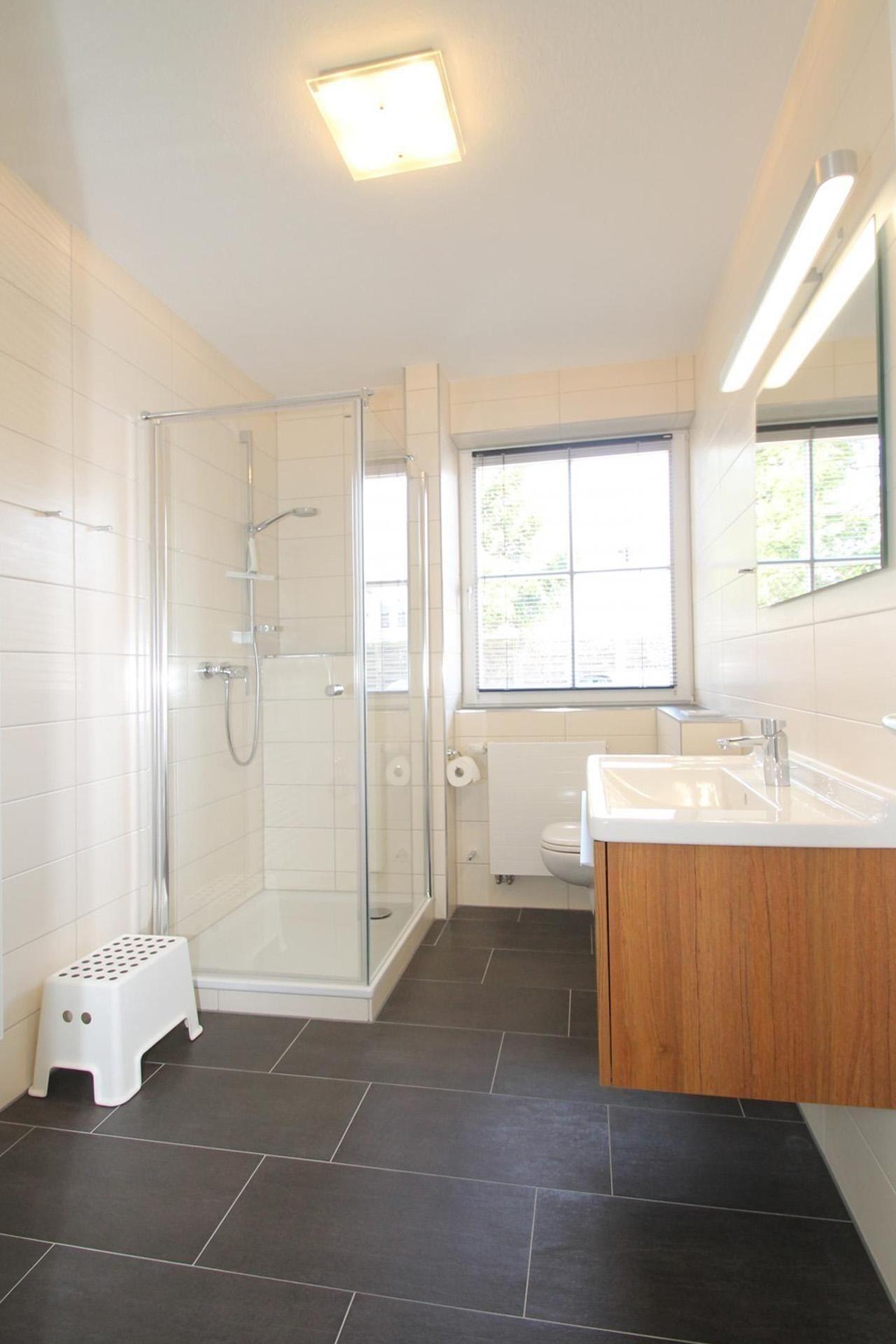Das Tageslicht-Badezimmer ist mit einer Dusche, einem großen Waschtisch mit Unterschrank und einem WC ausgestattet.