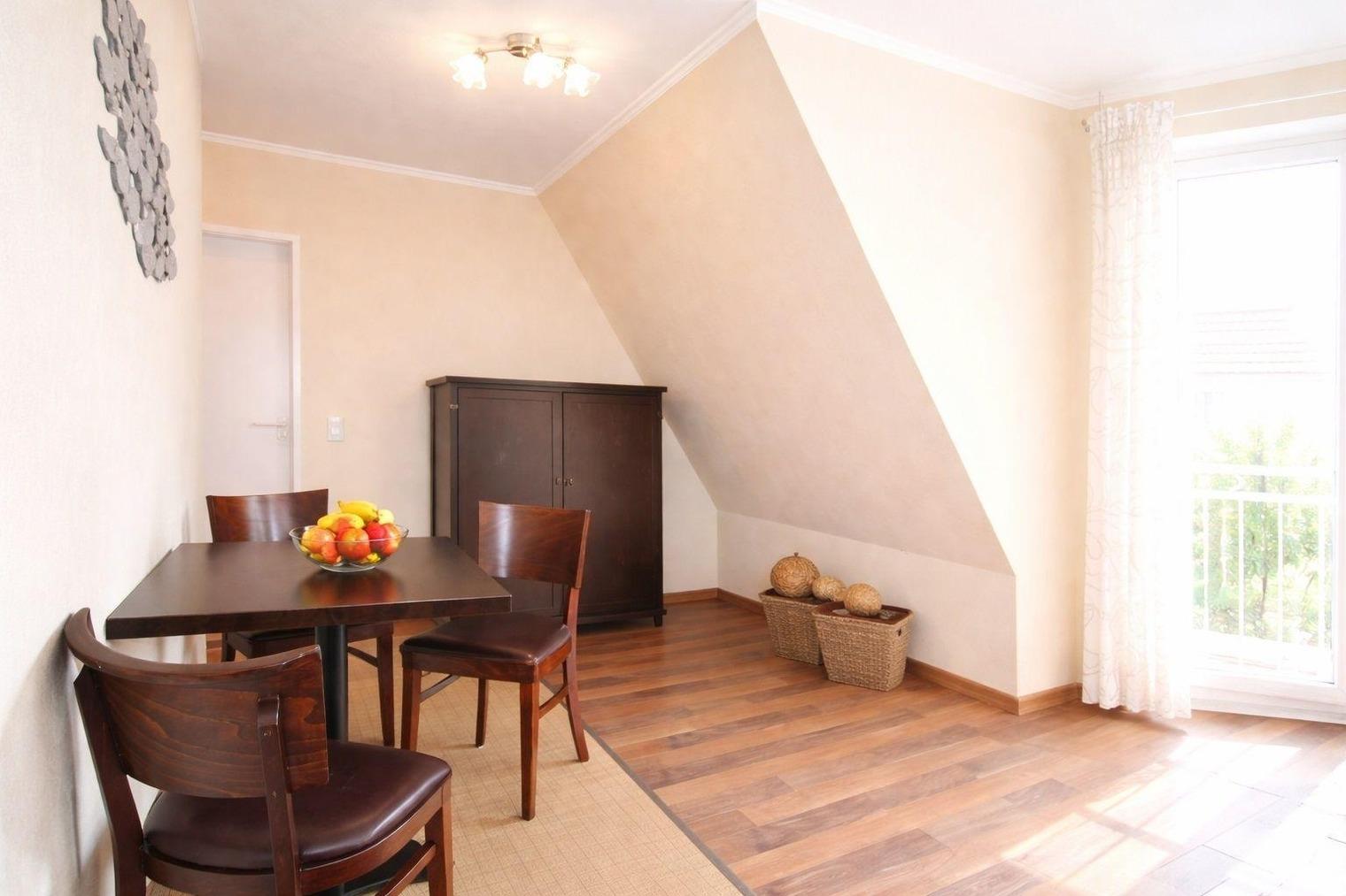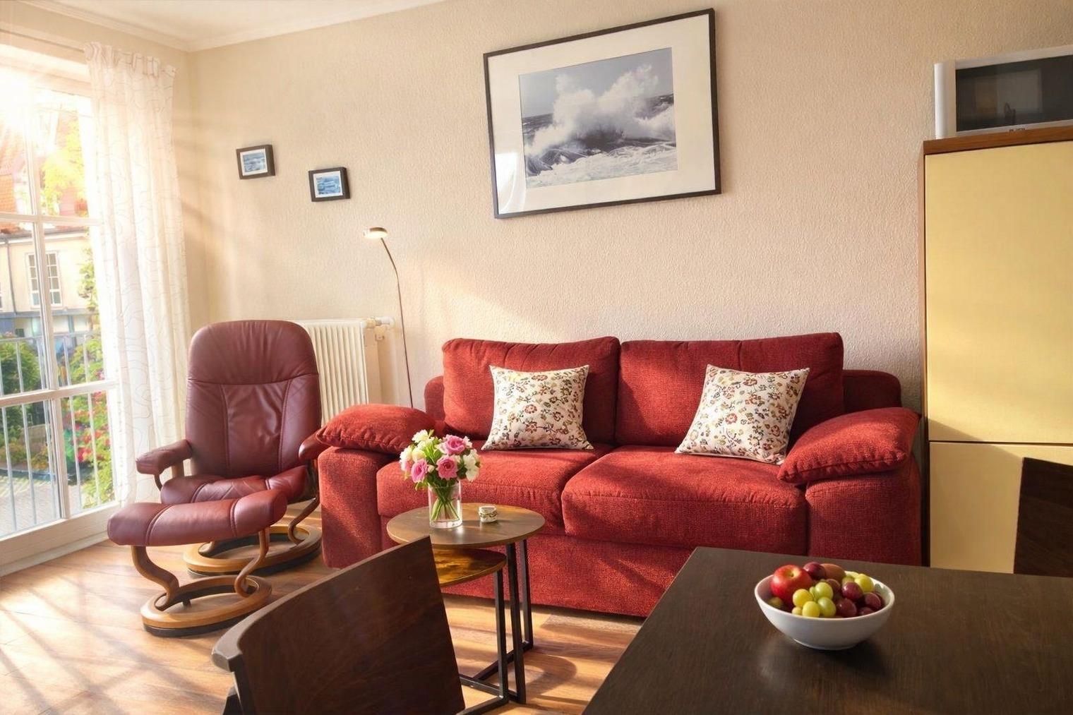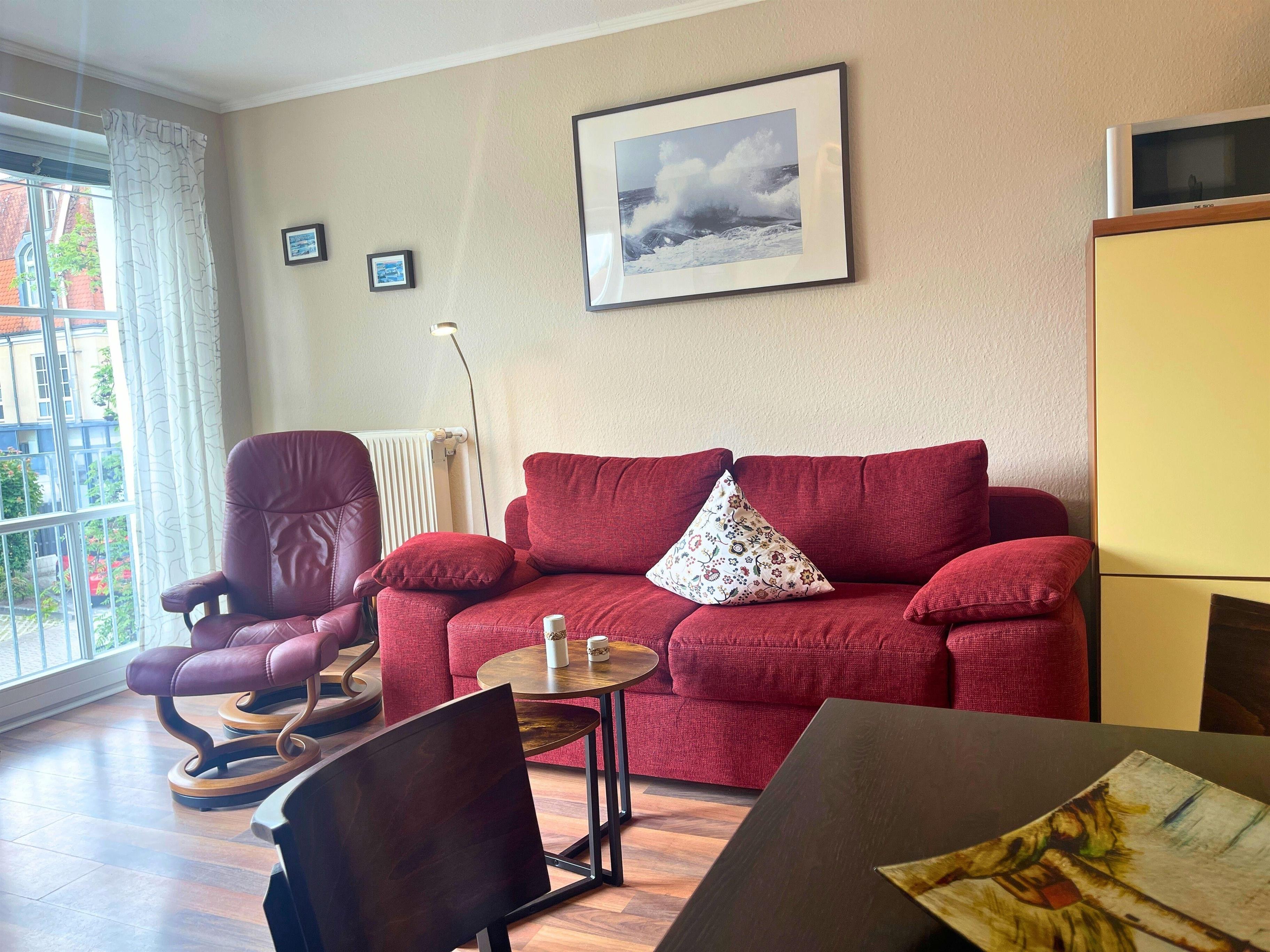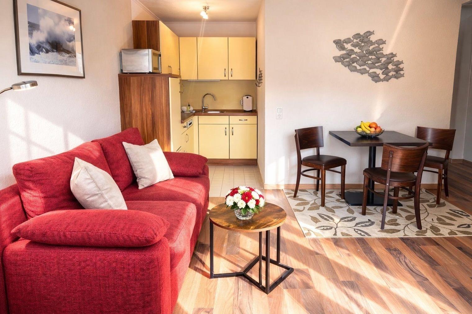 Die helle 2-Zimmer-Wohnung für bis zu 3 Personen besticht durch Ihre großen Fenster und den besonderen Lichteinfall, der ein behagliches Ambiente schafft.
