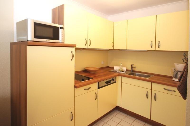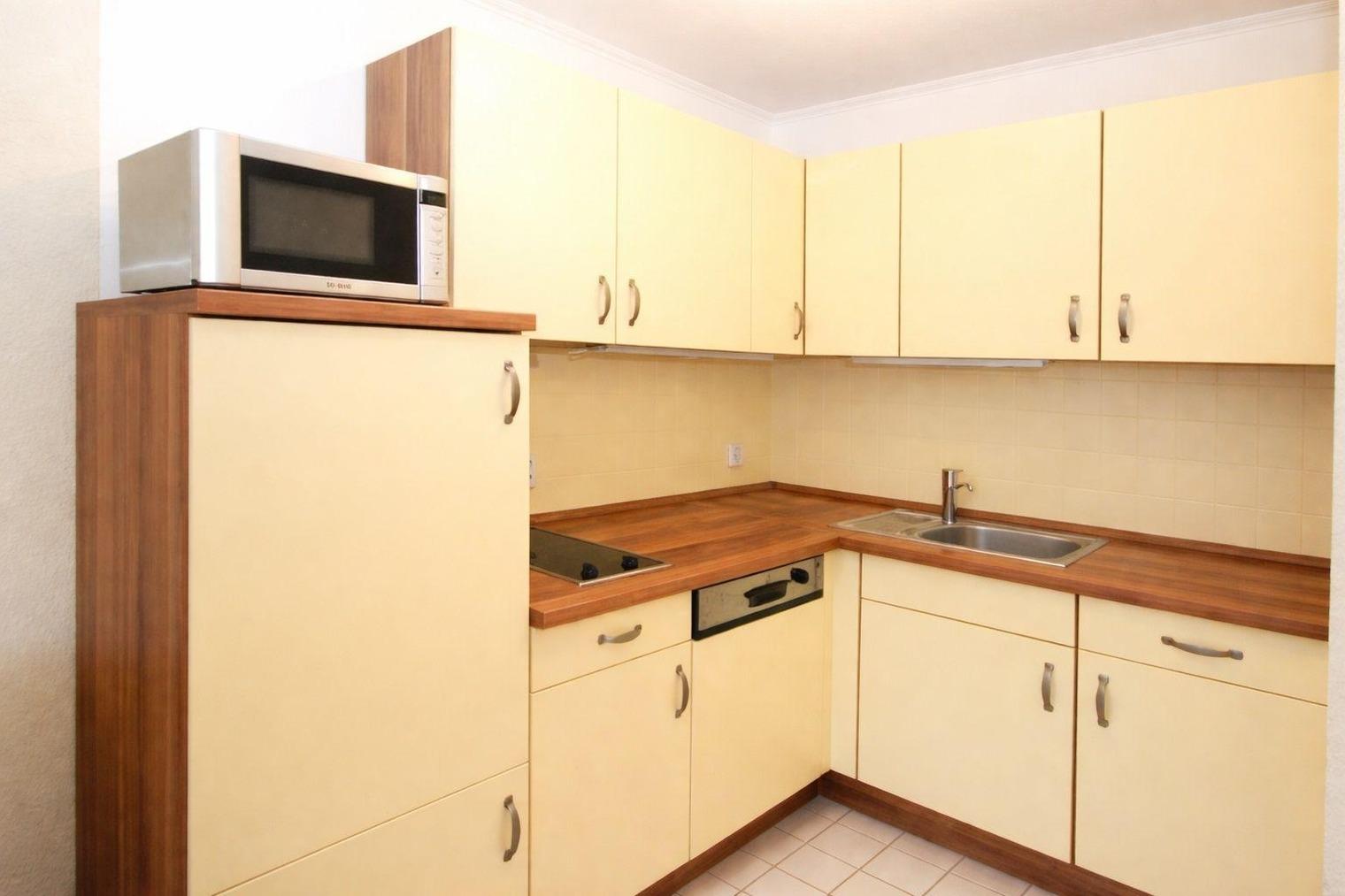 Die angrenzende Wohnküche ist komplett mit Ceran-Kochfeld, einem Kühlschrank mit Gefrierfach ausgestattet. Selbstverständlich stehen auch sämtliche Haushaltsgeräte wie Toaster, Kaffeemaschine und Wasserkocher bereit. Hier müssen Sie auf nichts verzichten.