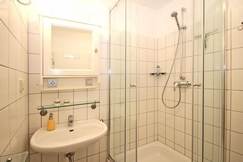 Das Badezimmer ist mit Dusche, Waschbecken und WC ausgestattet.