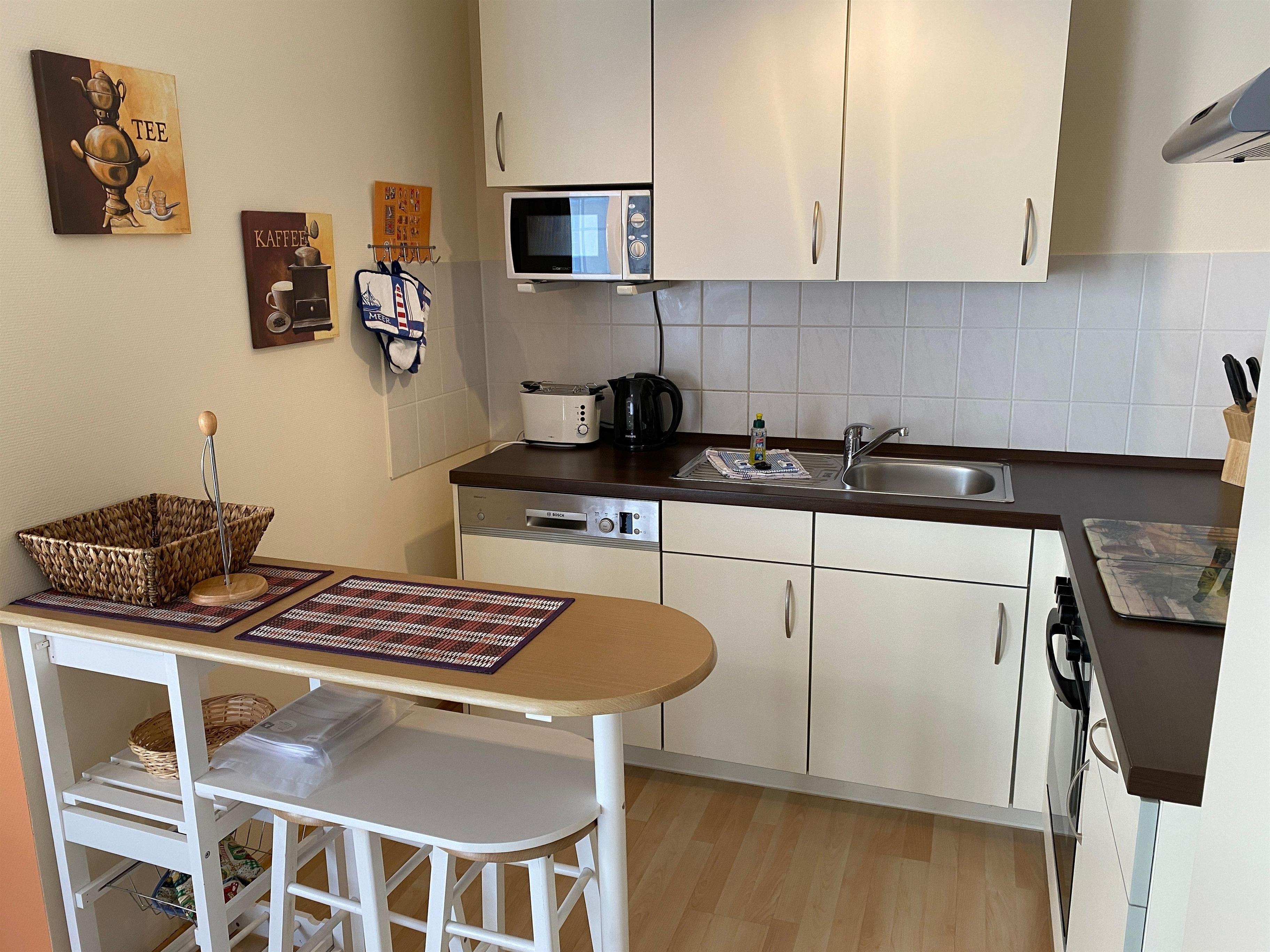 Die angrenzende Wohnküche ist komplett mit Ceranfeld, Backofen, Geschirrspüler und einer großen Kühl-Gefrierkombination ausgestattet. Selbstverständlich stehen auch sämtliche Haushaltsgeräte wie Toaster, Kaffeemaschine und Wasserkocher bereit.