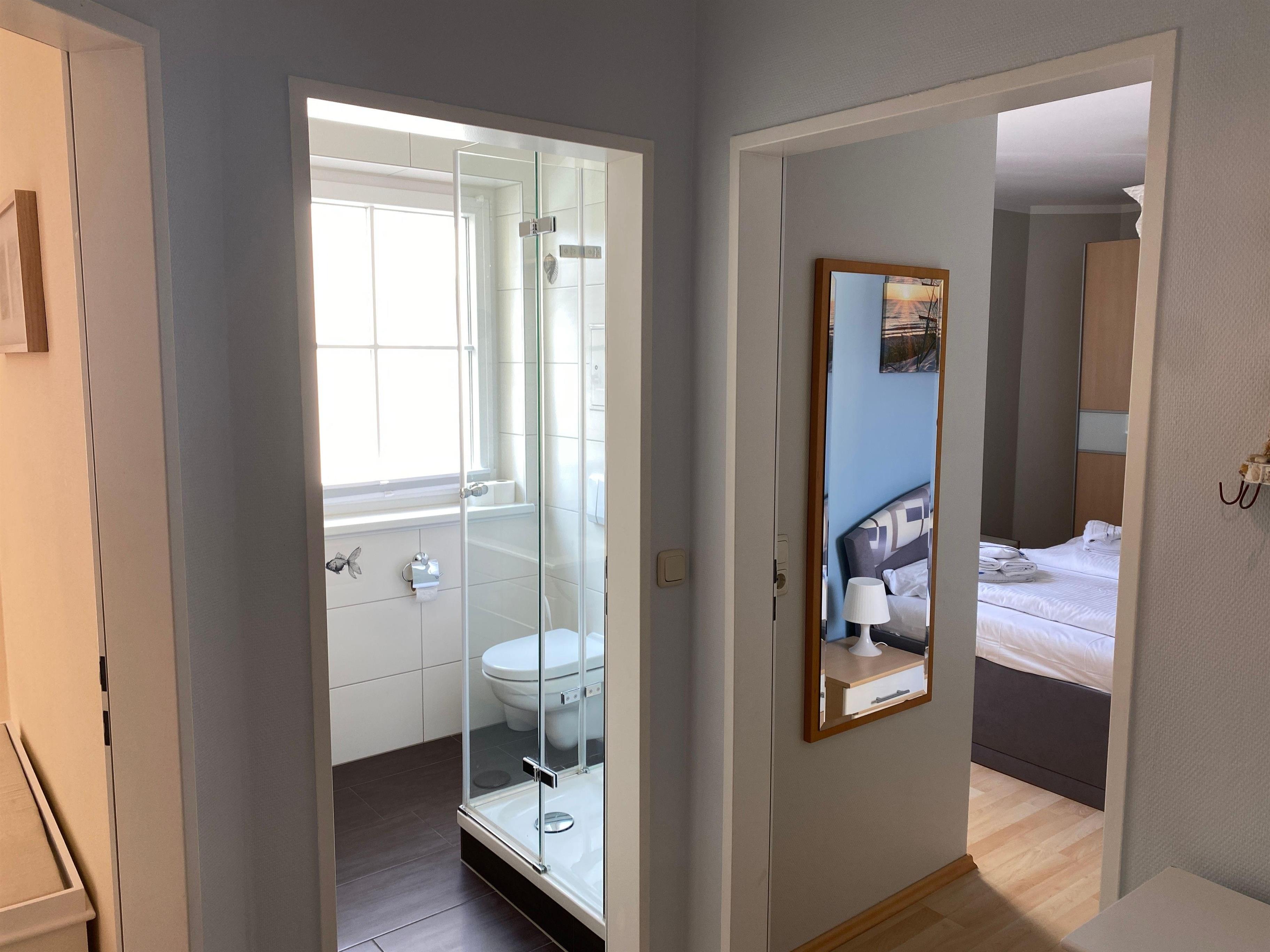 Das Badezimmer ist mit Dusche und WC ausgestattet.