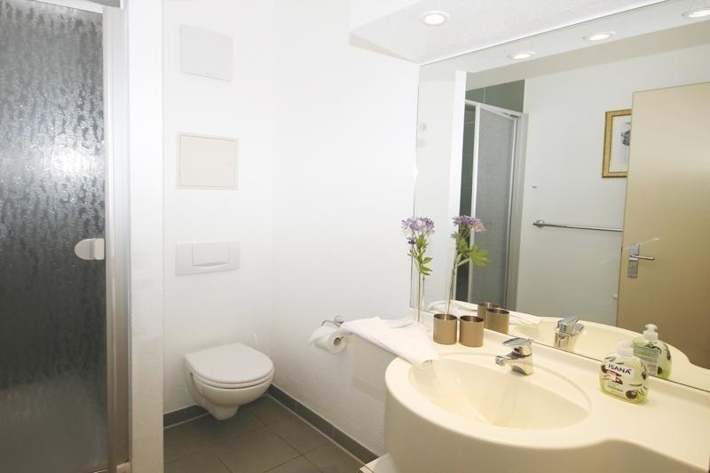Das Bad mit Dusche, Waschbecken mit Unterschrank und WC ergänzt die geschmackvoll eingerichtete Wohnung.