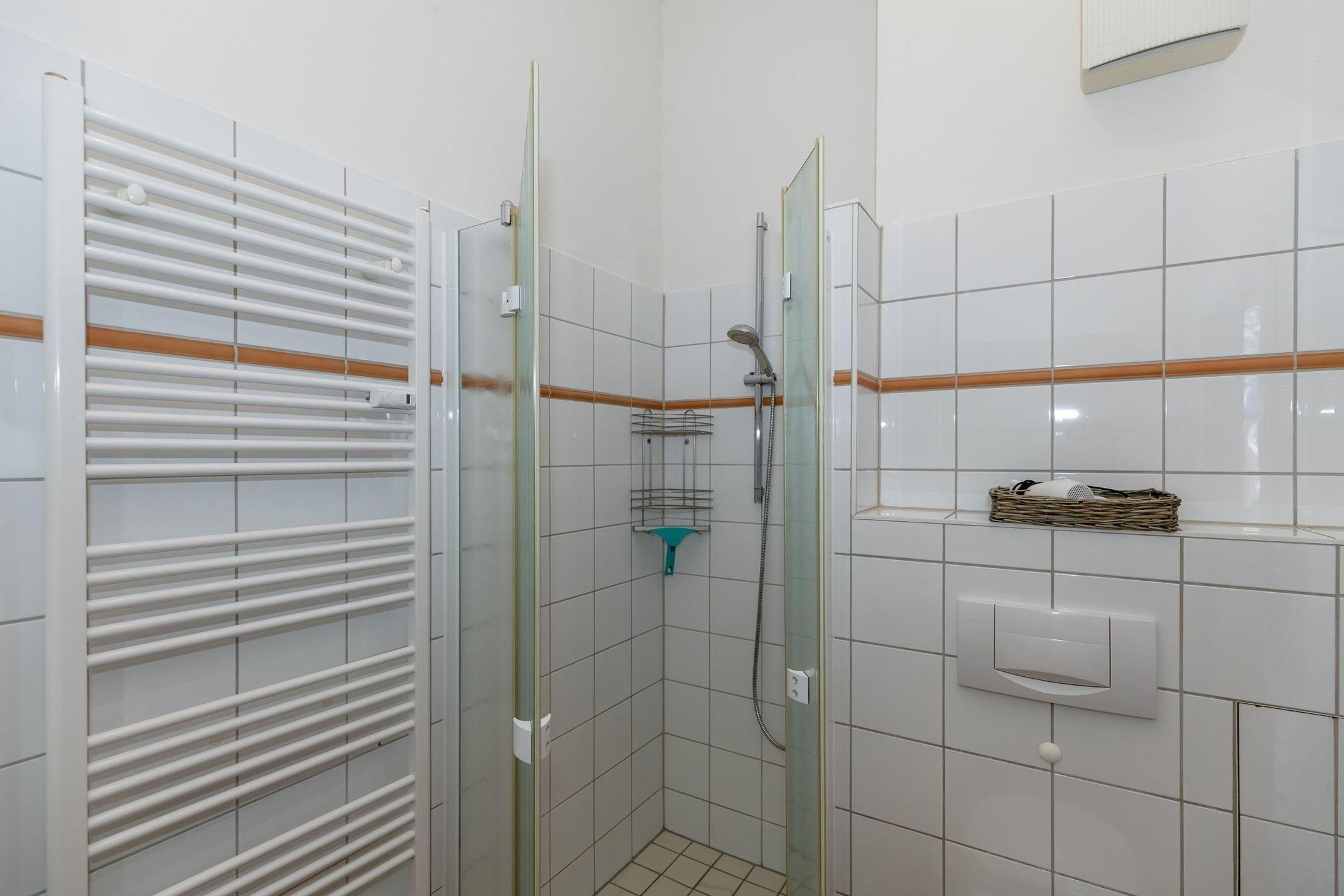 Das Badezimmer ist ausgestattet mit einer Dusche, einem WC, einem Handtuchheizkörper sowie einem ausladenden Waschtisch.