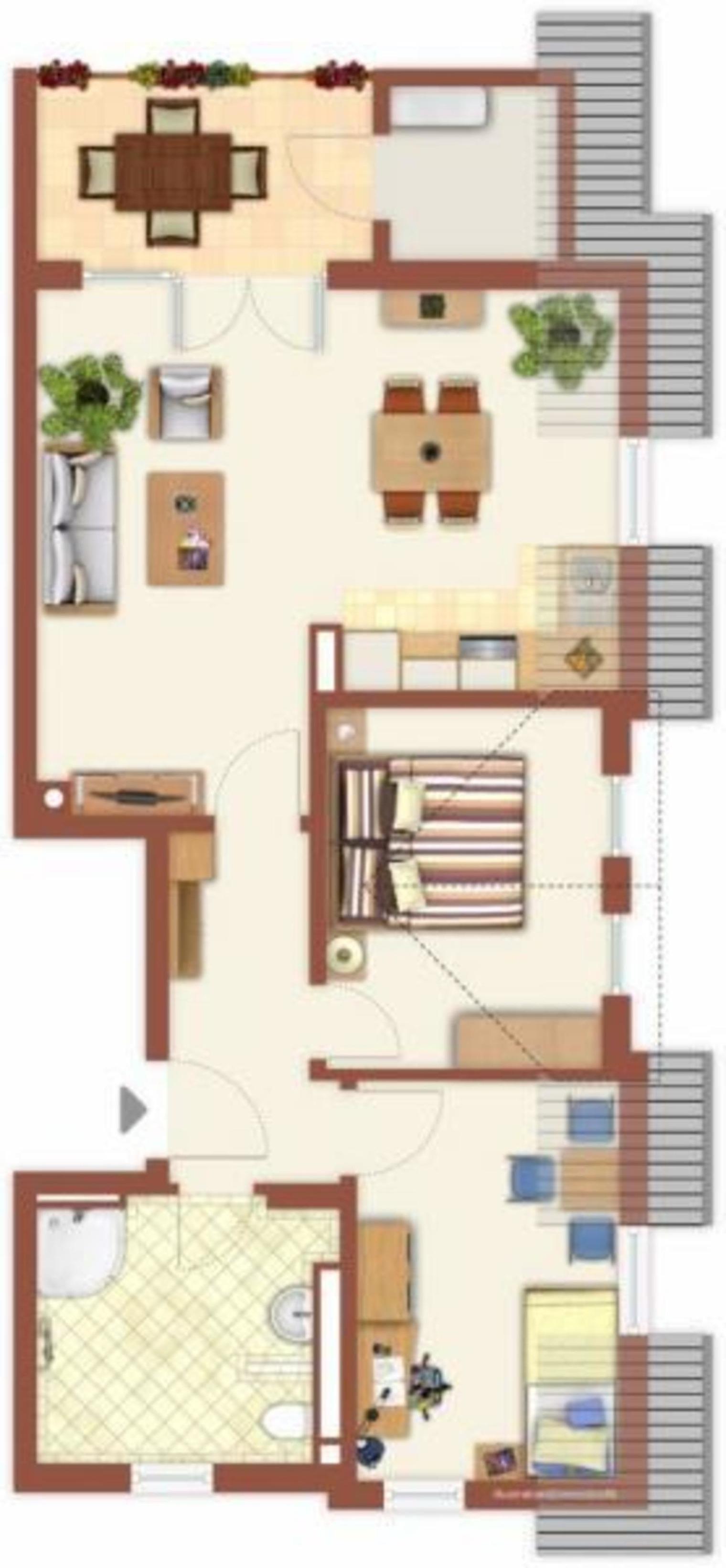 Der sonnige Südbalkon mit modernen Balkonmöbeln lädt zum Sonnenbaden und Erholen ein. Gönnen Sie sich hier gemütliche Stunden und lassen einen ereignisreichen Tag am Abend bei einem leckeren Getränk gemeinsam ausklingen. Urlaubs-Feeling pur!
