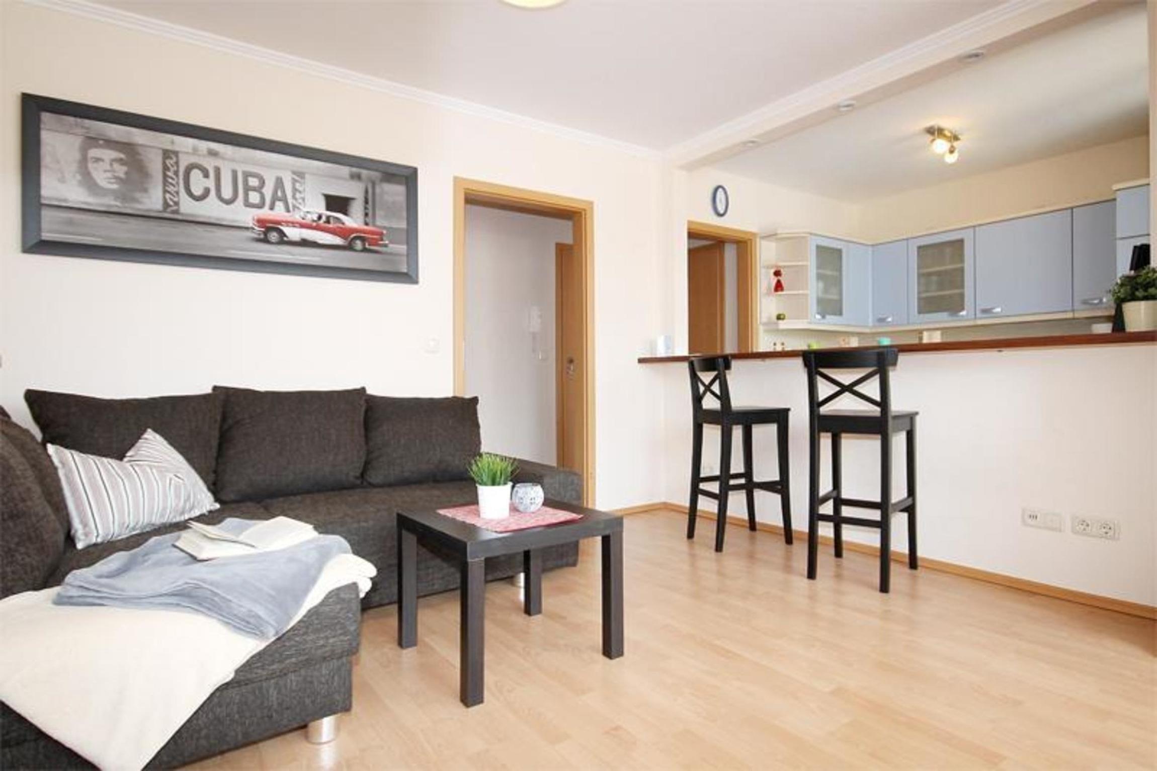 Zwischen Küche und Wohnraum wurde ein Durchbruch geschaffen, ein Bartresen verbindet nun beide Räume. So wird Kochen zum gemeinsamen Erlebnis. Natürlich stehen auch sämtliche Elektrogeräte wie Toaster, Wasserkocher, Kaffeemaschine und eine Mikrowelle zur Verfügung. Zudem verfügt die Küche über einen Backofen, einem 4-Platten-Ceran-Kochfeld und einen Geschirrspüler.
