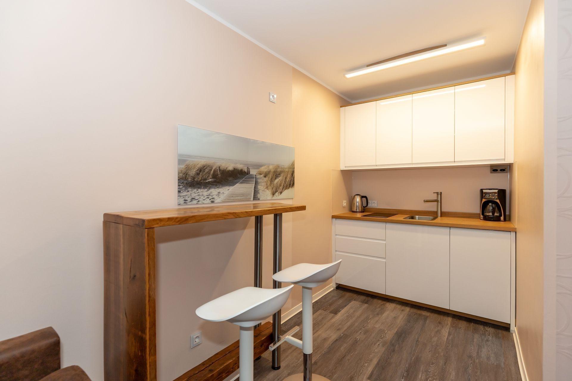 Der Küchenbereich grenzt direkt an den Wohnbereich, sodass auch der Koch oder die Köchin nicht vom Geschehen abgeschnitten sind. Die Küche ist voll ausgestattet, schnell und bequem können Sie Ihre Lieblingsmahlzeit zaubern.