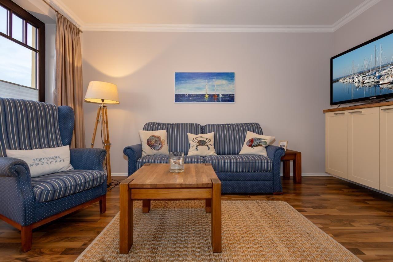 Der Wohnraum mit Ohrensessel und Schlafcouch strahlt Komfort und Gemütlichkeit aus und bildet eine Einheit mit integrierter, voll ausgestatteter Küche, die keine Wünsche offen lässt.