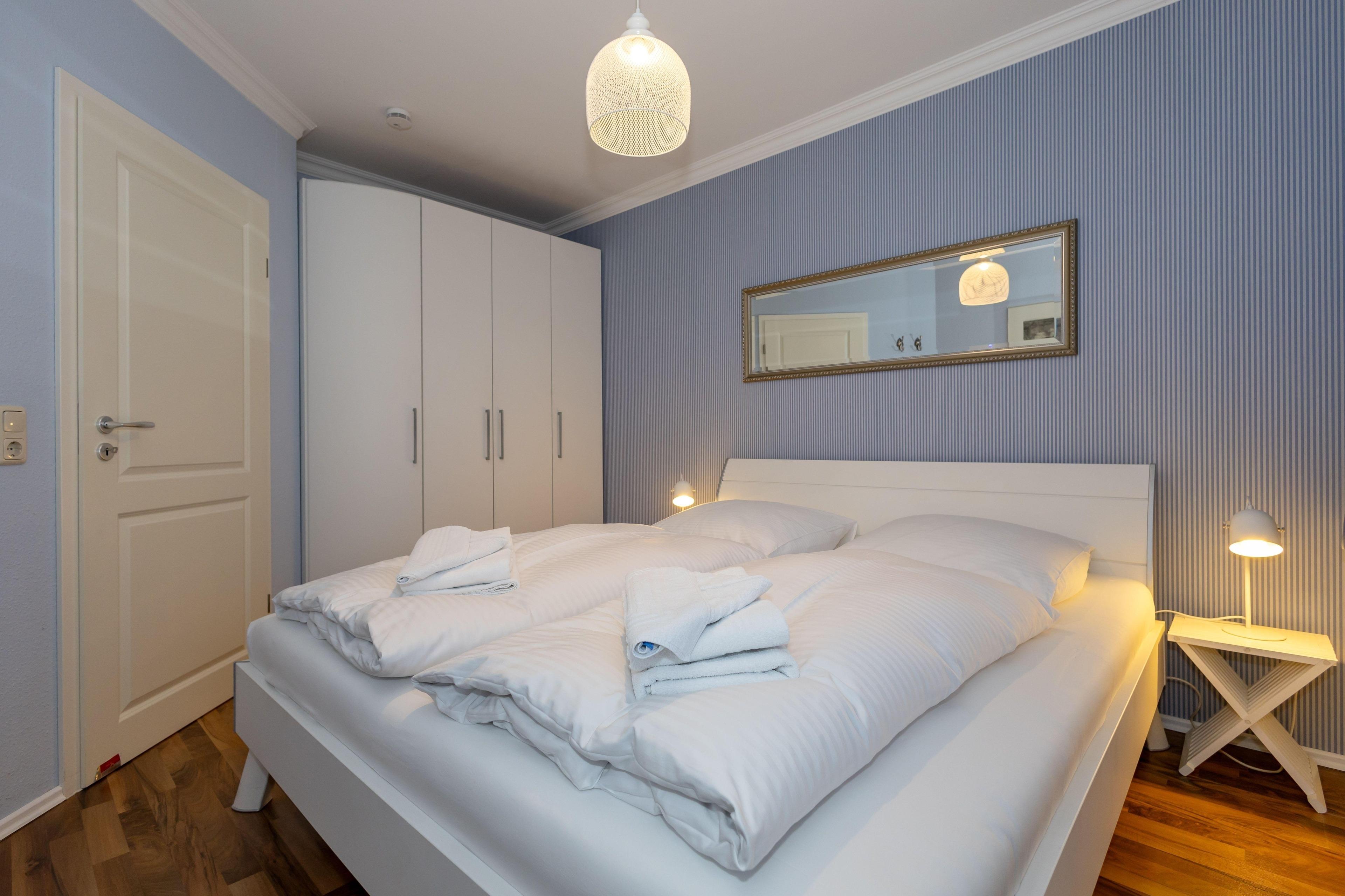 Der maritime Charme des Schlafzimmers mit dem bequemen Doppelbett und geräumigem Kleiderschrank garantiert einen erholsamen Schlaf, so können Sie voller Tatendrang in einen neuen ereignisreichen Urlaubstag starten.