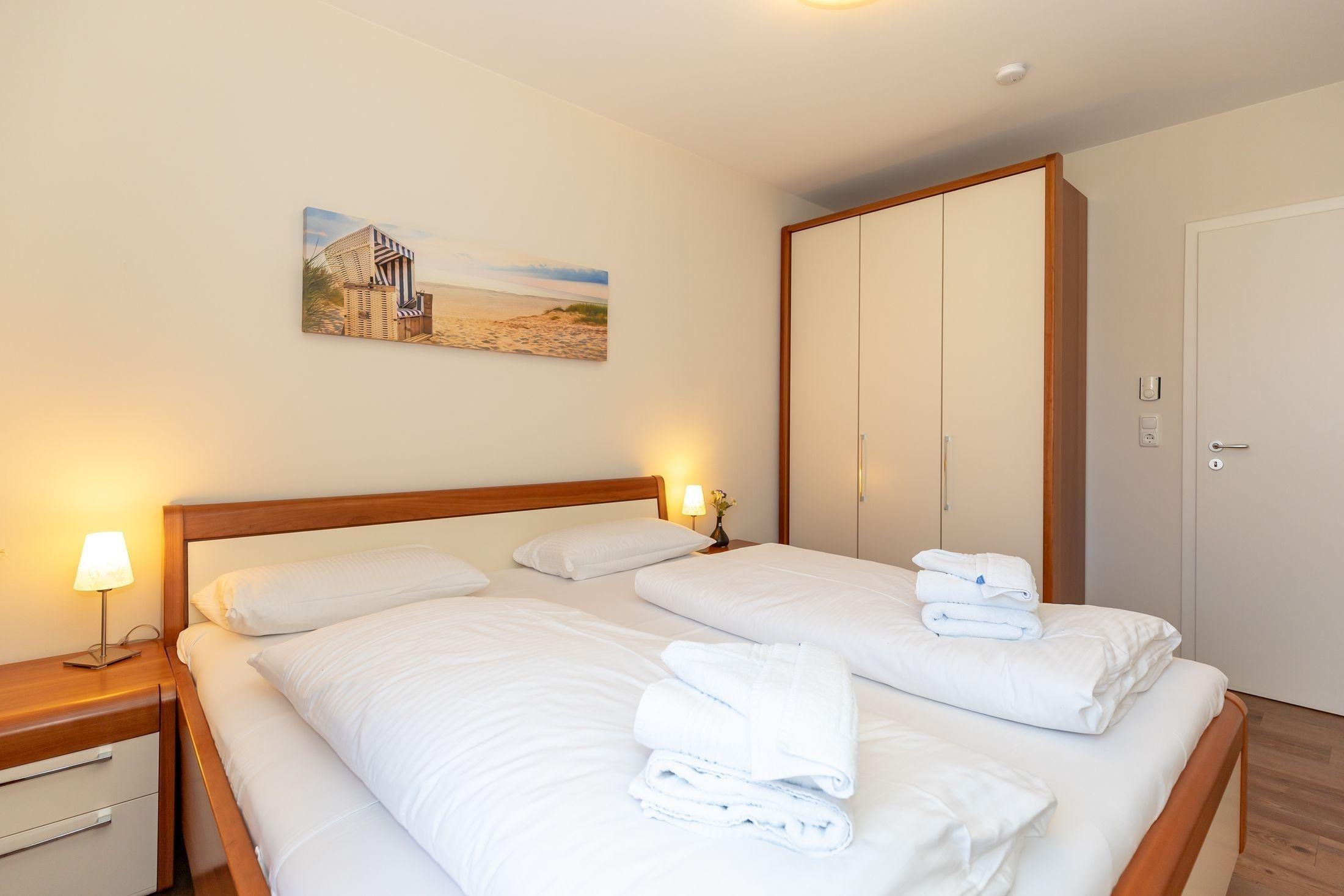 Im 1. Schlafzimmer befindet sich ein komfortables Doppelbett. Zwei Einzelbetten, die Platz für 2 Erwachsene bieten, befinden sich im 2. Schlafzimmer/Kinderzimmer.