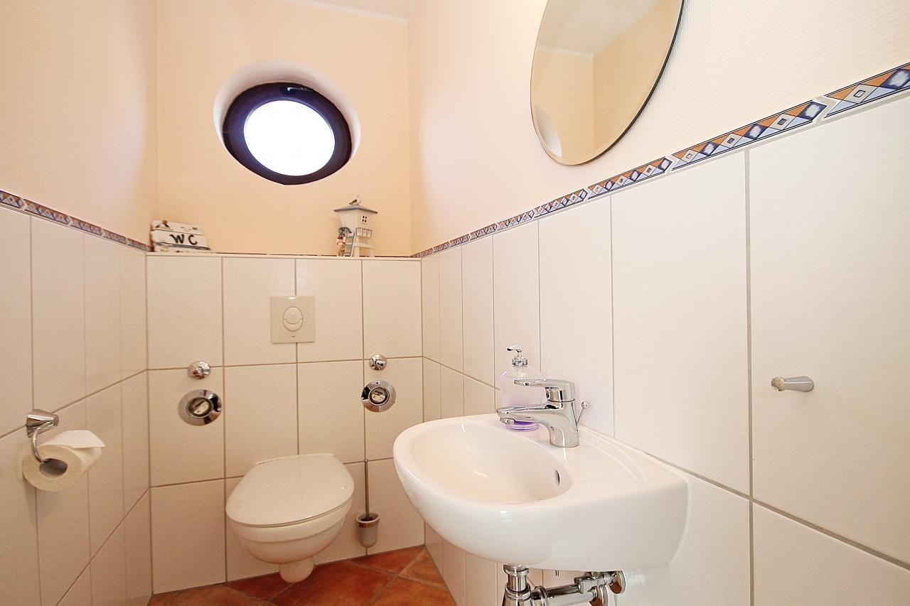 Das WC und ein weiteres Handwaschbecken befinden sich in einem separaten Raum.