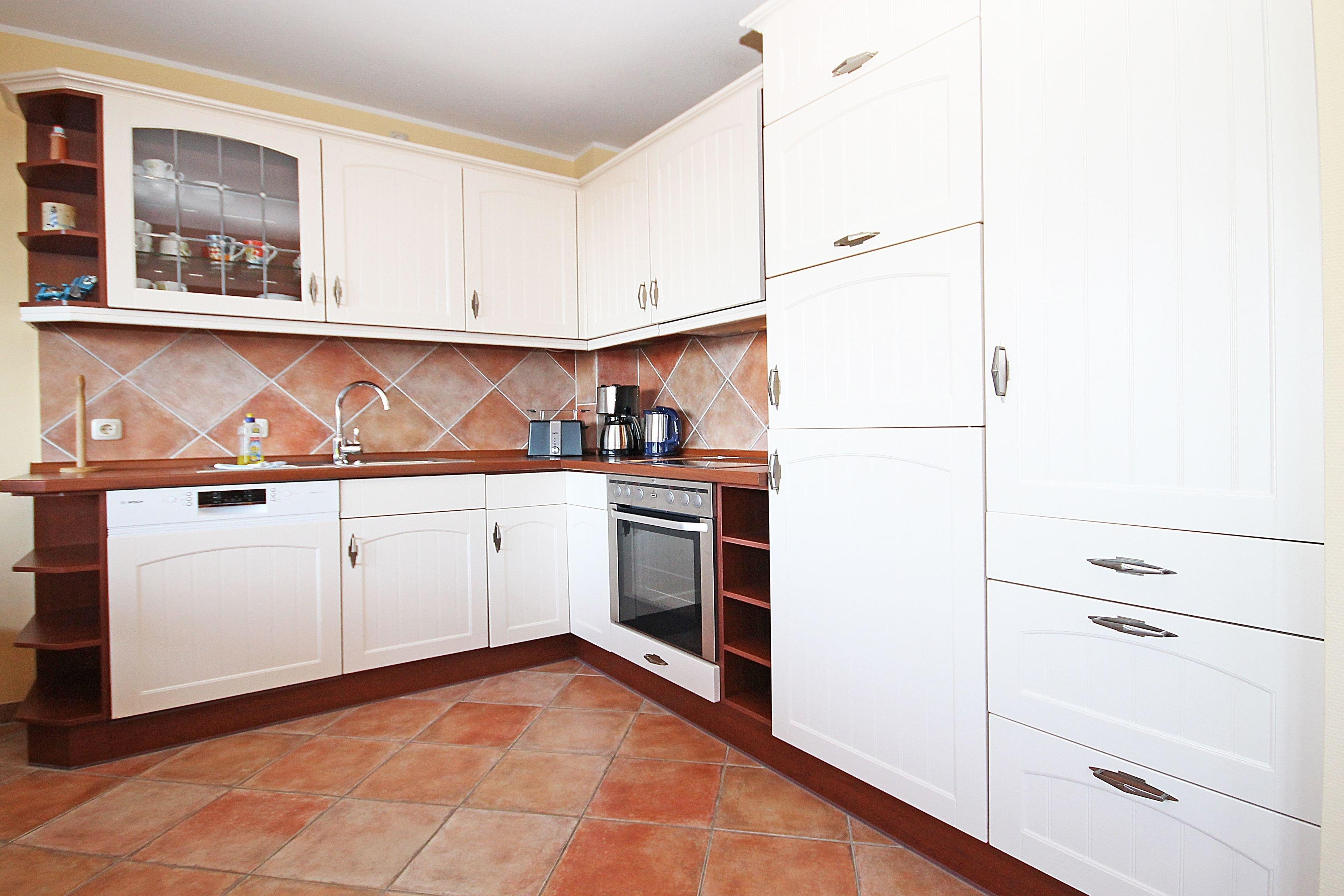 An den Wohnbereich grenzt die voll ausgestattete offene Küche. Hier finden Sie alle Geräte und Küchenutensilien, die in einer modernen Küche nicht fehlen dürfen.