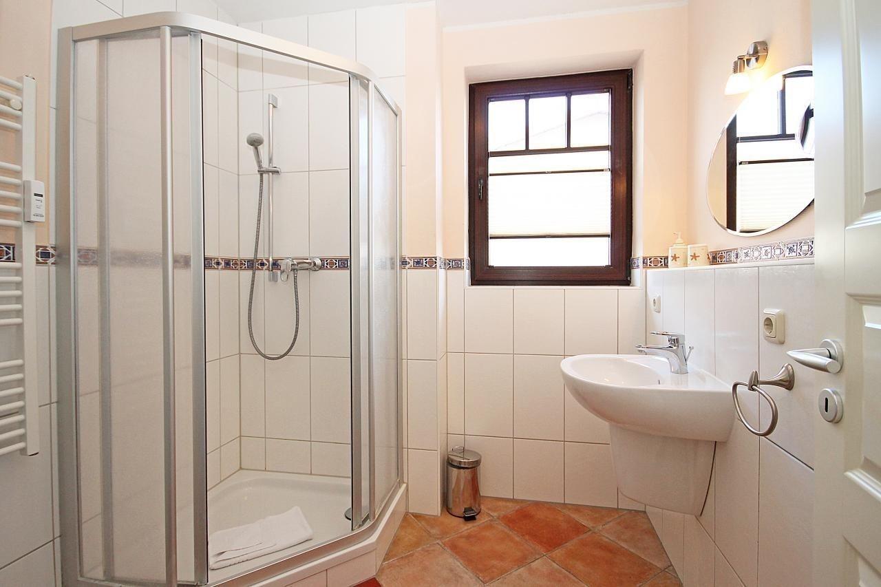 In dem geschmackvoll gestalteten Badezimmer befinden sich ebenfalls vielfältige Ablagemöglichkeiten. Es ist mit einem Waschbecken und einer Eckdusche ausgestattet, die einen tiefen und angenehmen Einstieg ermöglicht.