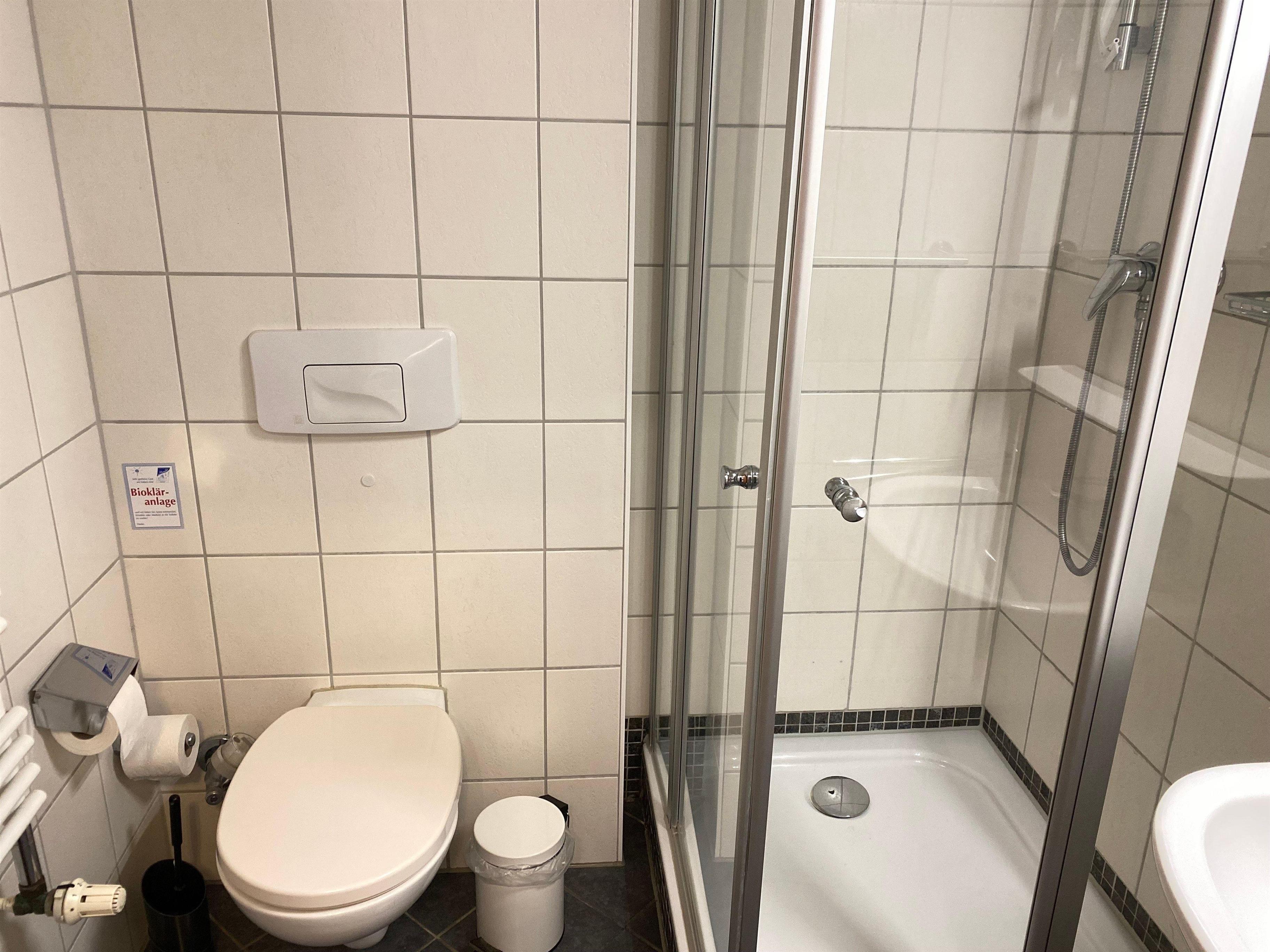 Das Badezimmer ist mit einer Dusche, einem Waschbecken, einem Handtuchheizkörper und einem WC ausgestattet.