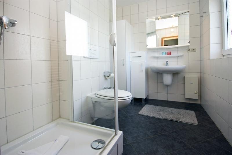 Das Badezimmer ist mit einer Dusche, einem Waschbecken und einem WC ausgestattet.