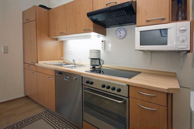 An den Wohnbereich grenzt die Küchenzeile, diese ist voll ausgestattet und bietet Ihnen alle Bequemlichkeiten einer modernen Küche. Schnell sind hier Ihre Mahlzeiten hergerichtet, die Sie gemeinsam am vorhandenen Esstisch einnehmen können.