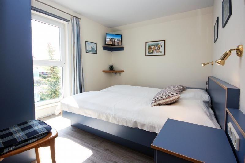 Das separate Schlafzimmer ist mit einem komfortablen Doppelbett ausgestattet. Für Ihre Urlaubsgarderobe steht Ihnen ein geräumiger Kleiderschrank zur Verfügung. Ein zusätzliches Fernsehgerät sorgt auch hier für angenehme Unterhaltung.