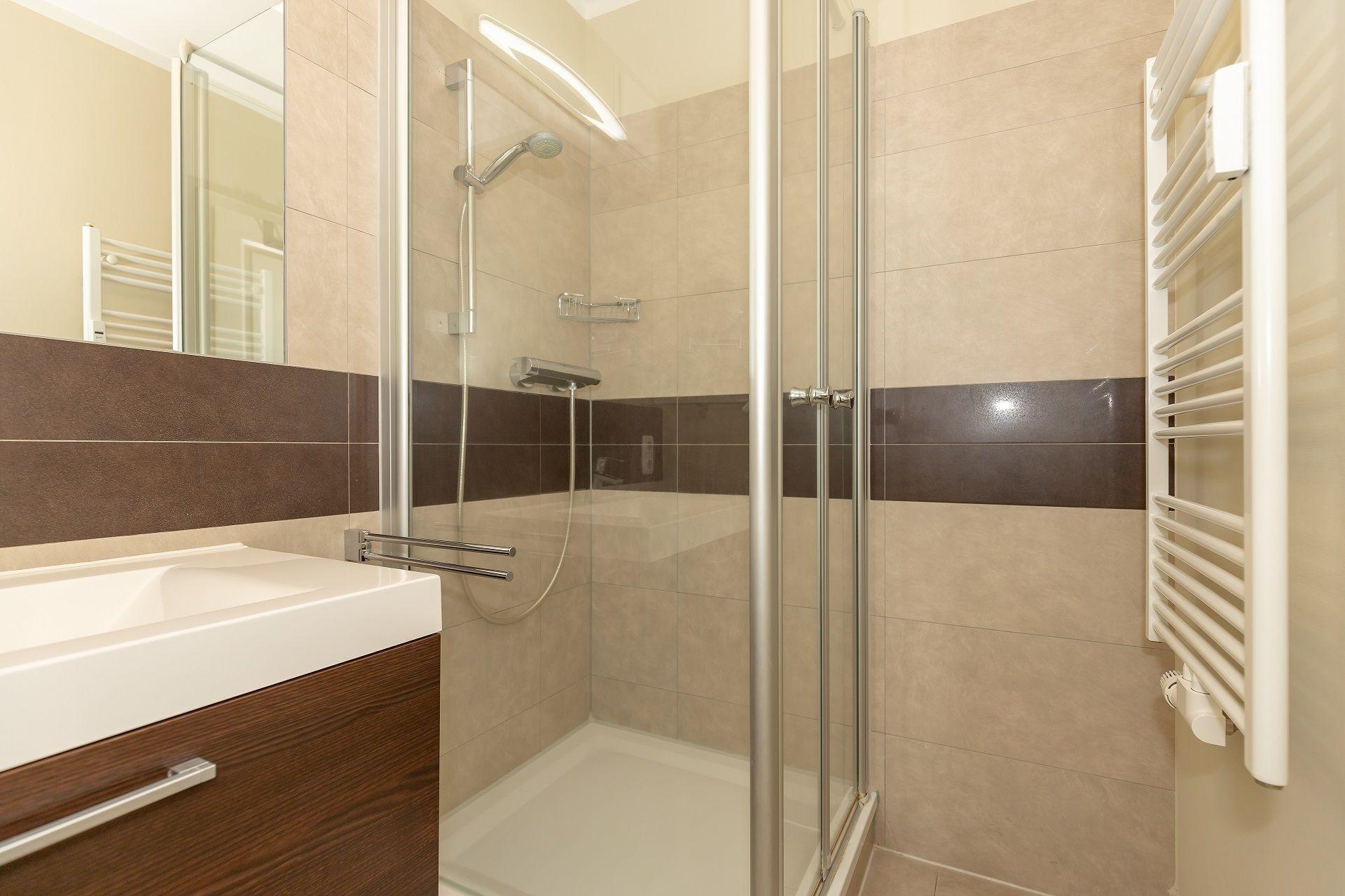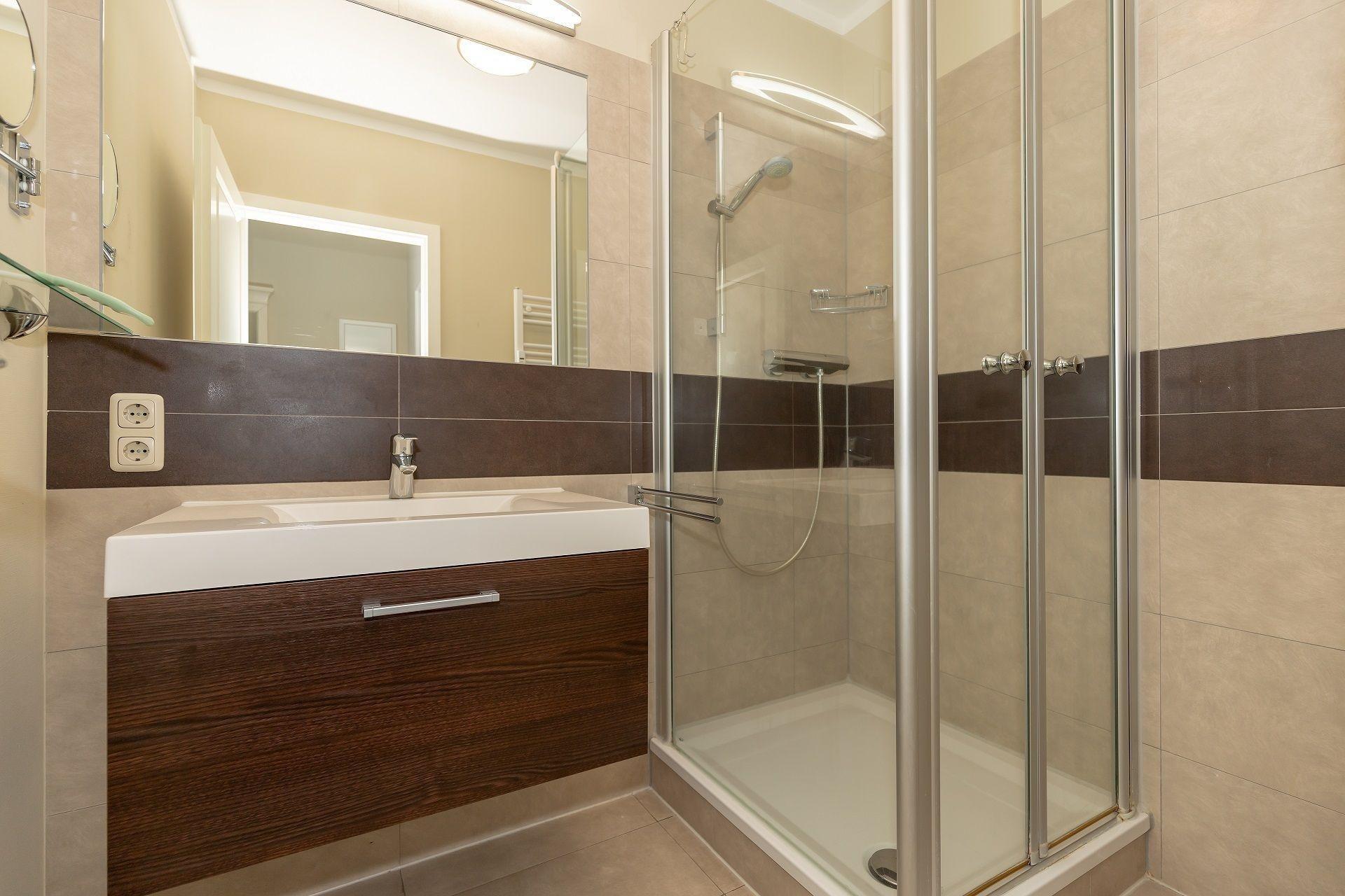Im stilvoll ausgestatteten Bad können Sie unter der Dusche (80 x 90 cm) entspannen und finden neben dem Handtuchheizkörper einen Kosmetikspiegel, einen Föhn sowie einen Waschtisch mit Platz zum Verstauen und Ablegen. Das gleichermaßen geflieste WC mit einem großzügigen Waschbecken befindet sich separat.