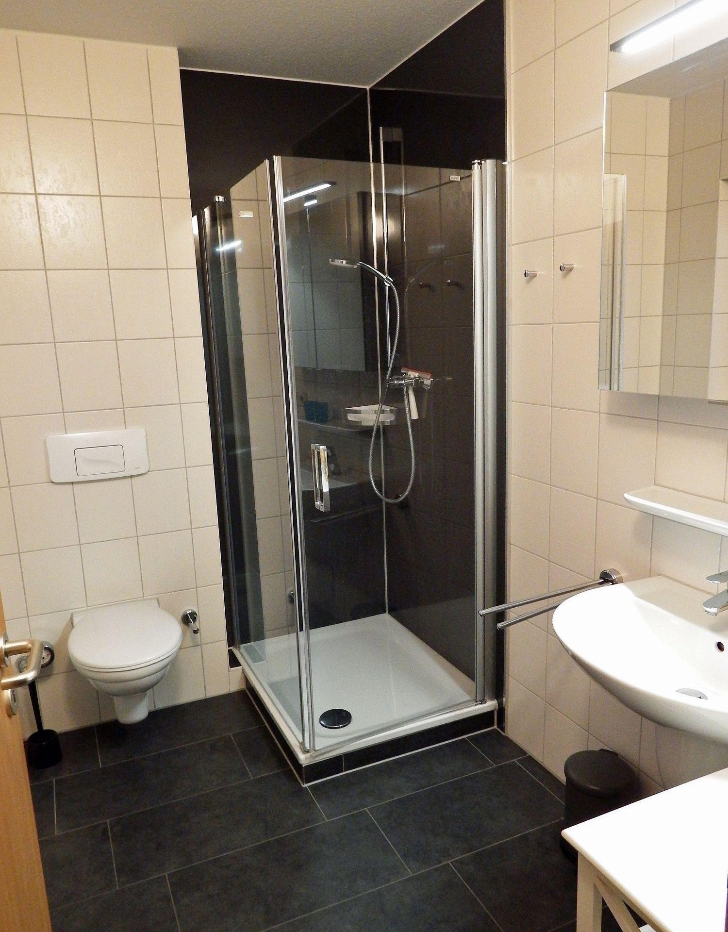 Das hochwertige Badezimmer mit Fenster verfügt über eine Dusche mit tiefem Einstieg, Wand-WC, Spiegelschrank, Waschbecken sowie Handtuchheizkörper. Ein Föhn ist ebenfalls vorhanden.