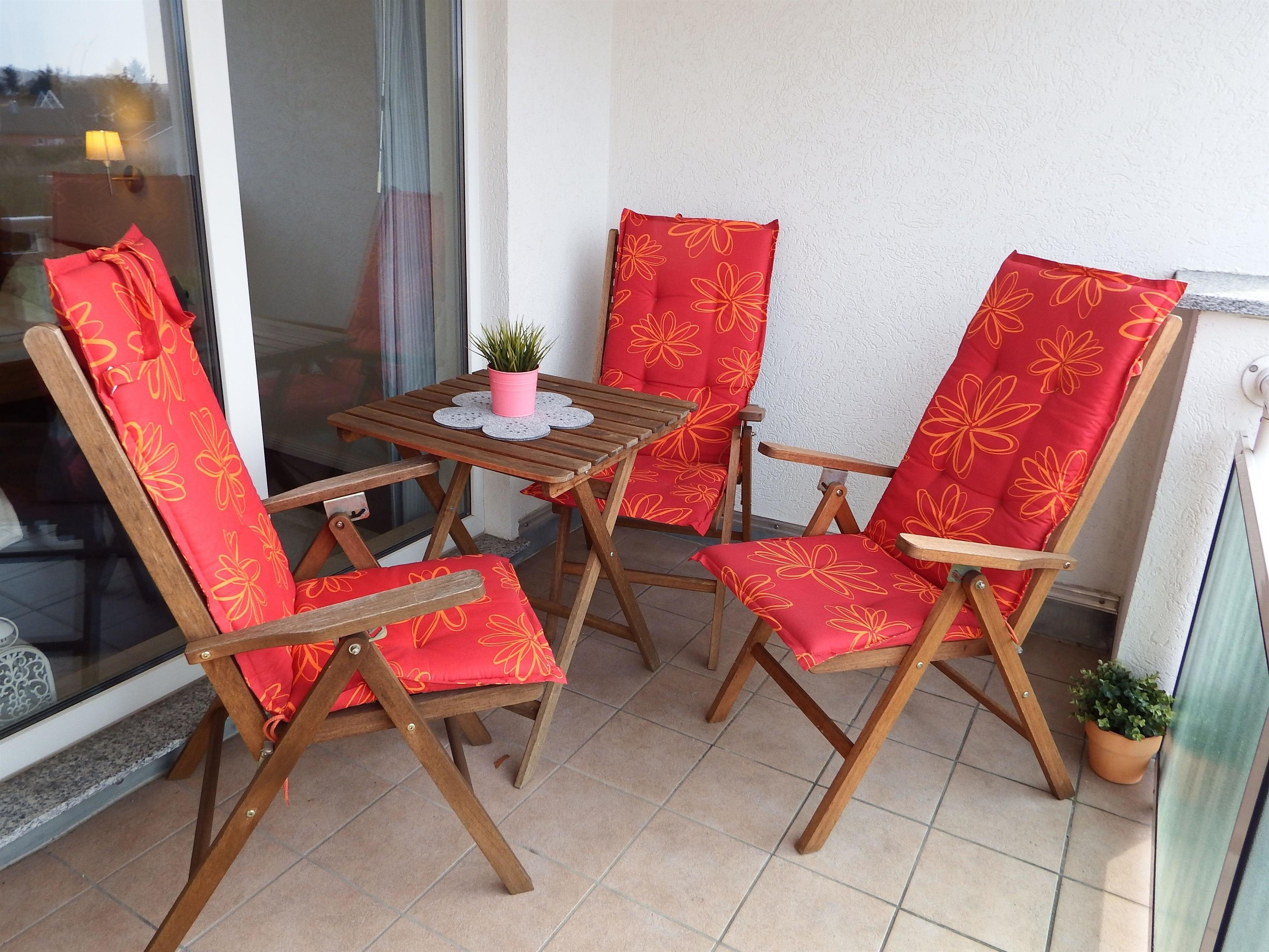 An Ihre Wohnung grenzt ein überdachter Balkon, der nach Süden ausgerichtet ist. Moderne Balkonmöbel laden hier zum Verweilen ein. Auch im Frühjahr und Herbst können Sie Sonne satt genießen. Ein hübscher Strandkorb sorgt für das besondere maritime Ambiente. Auf dieser kleinen Wohlfühloase können Sie Ihre Urlaubstage in vollen Zügen genießen.