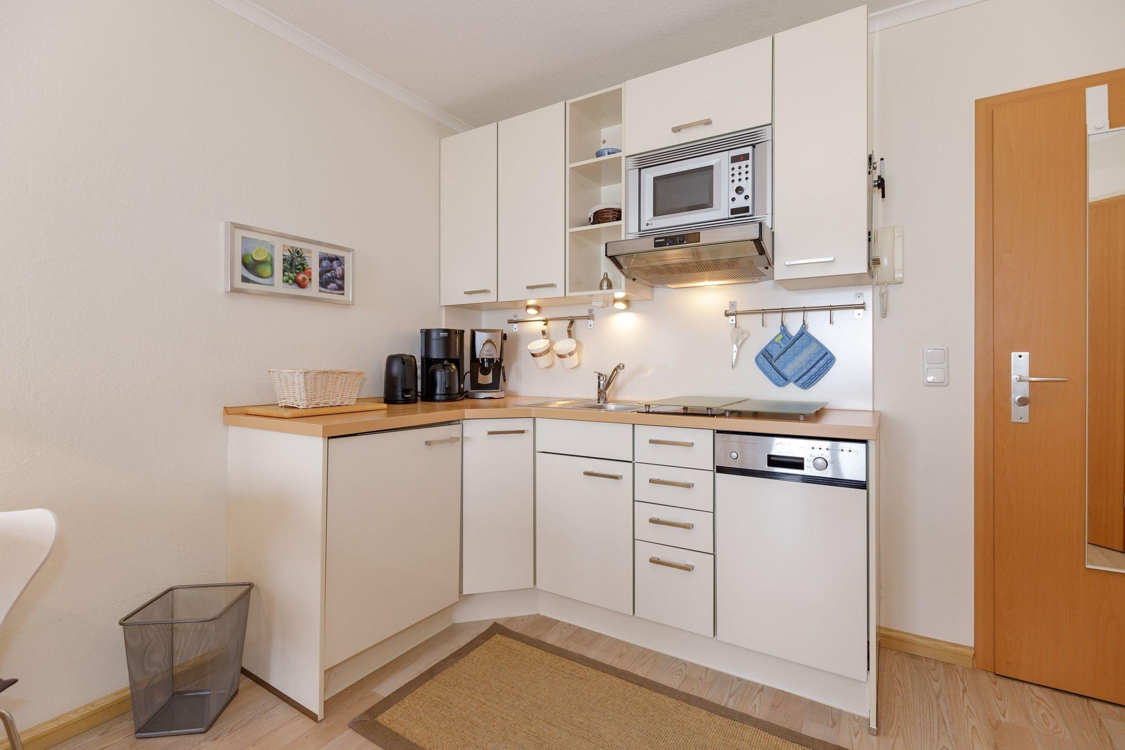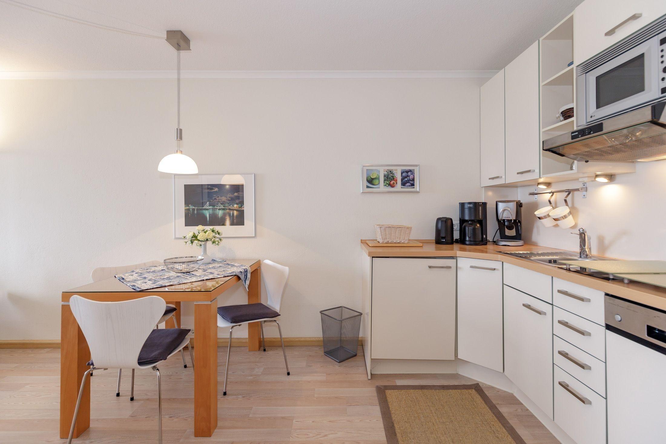 Der geschmackvoll gestaltete Essbereich grenzt an die Küchenzeile, die voll ausgestattet ist. Alle modernen Geräte sowie weitere Küchenutensilien sind vorhanden, schnell sind Ihre Lieblingsmahlzeiten angerichtet.