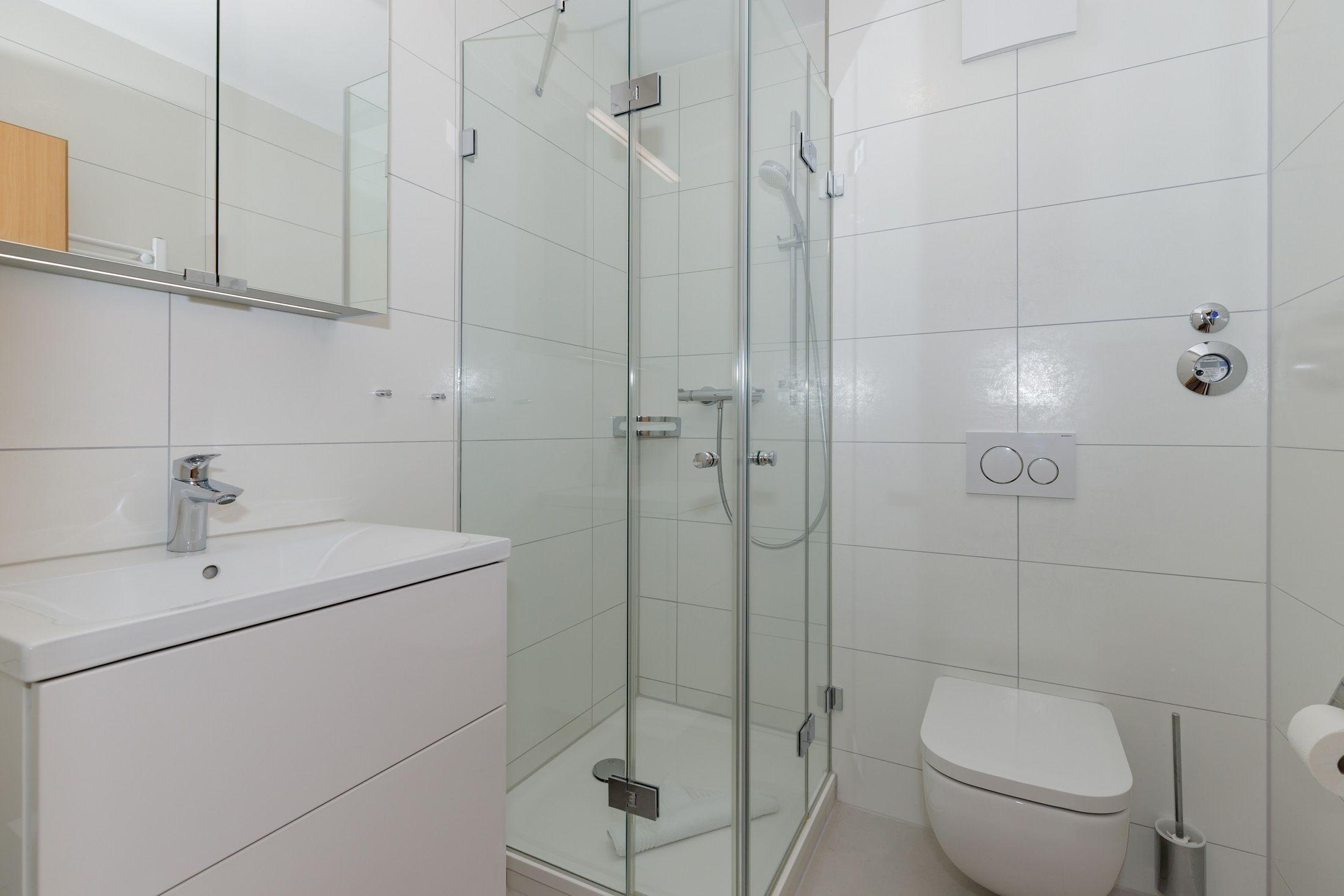 Das Badezimmer ist mit einer Dusche, einem Waschbecken mit Unterschrank für Ihr Badutensilien, einem WC, einem Handtuch- Heizkörper, Föhn und Kosmetik-Spiegel ausgestattet.