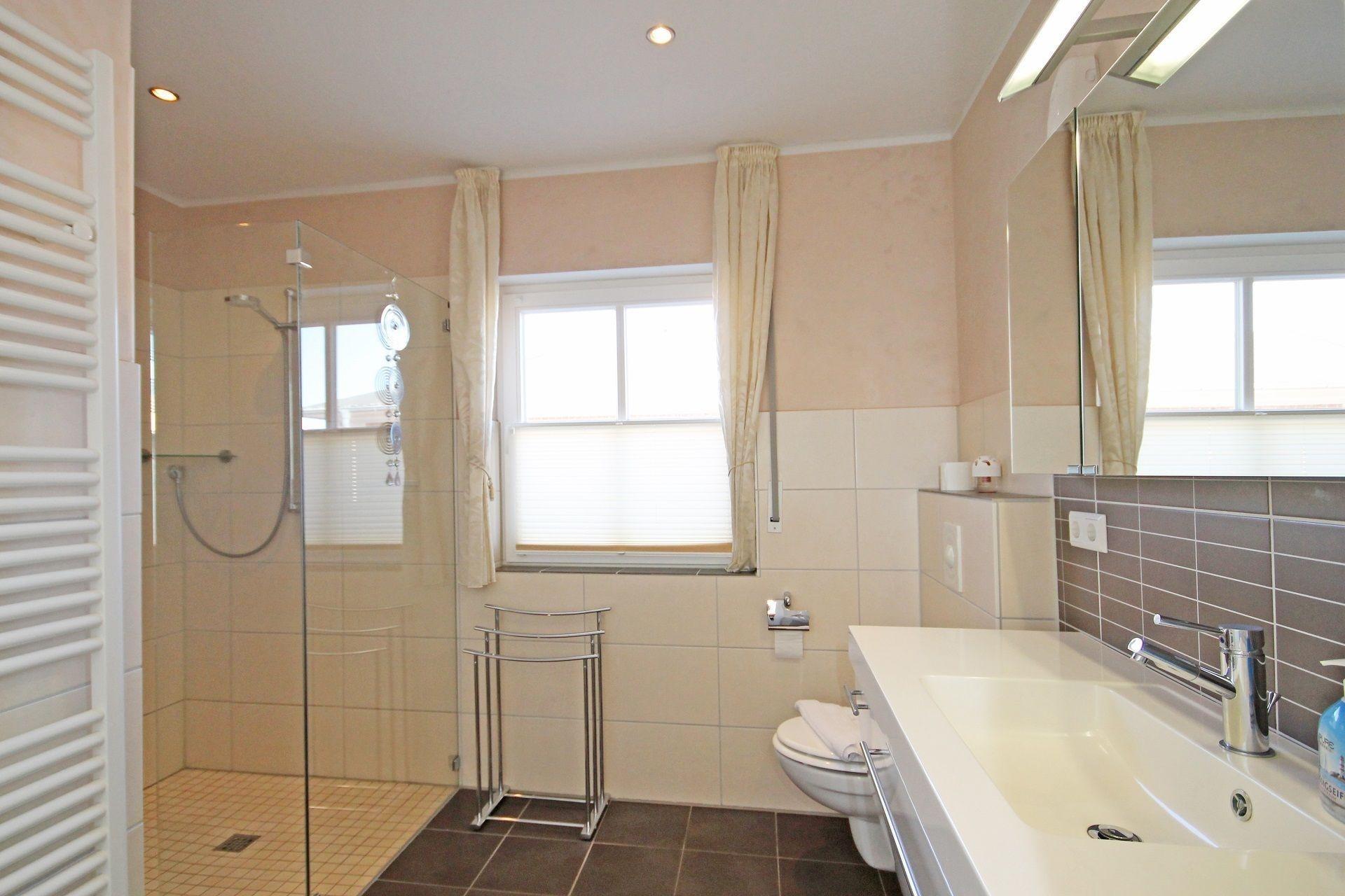 Das luxuriöse Badezimmer verfügt über eine ebenerdige Dusche, ein WC, ein großes Waschbecken mit Unterschrank sowie einen Handtuchheizkörper. Eine stimmungsvolle Beleuchtung sorgt für Wohlfühlatmosphäre.