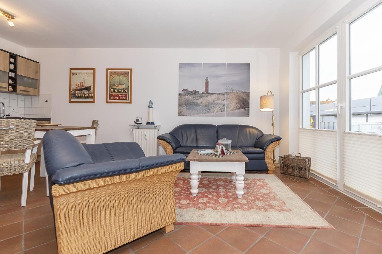 Im Wohnbereich befindet sich eine gemütliche Couch mit einem bequemen Sessel, hier können Sie entspannt bei einem leckeren Getränk gemeinsam einen ereignisreichen Tag gemütlich ausklingen lassen.
