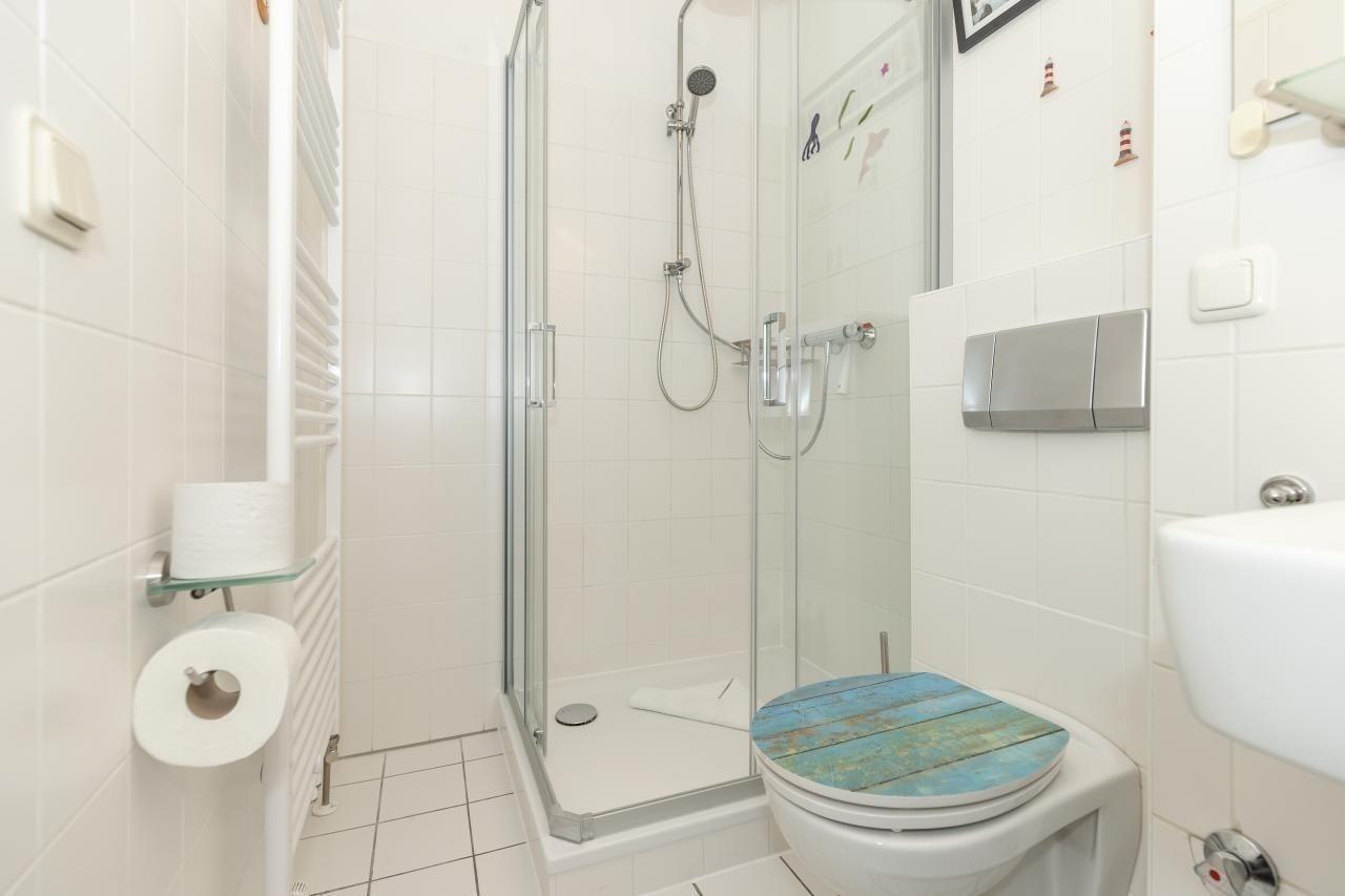 Das Badezimmer verfügt über eine Dusche, ein WC und ein Waschbecken und ist vom Flur aus zu erreichen.