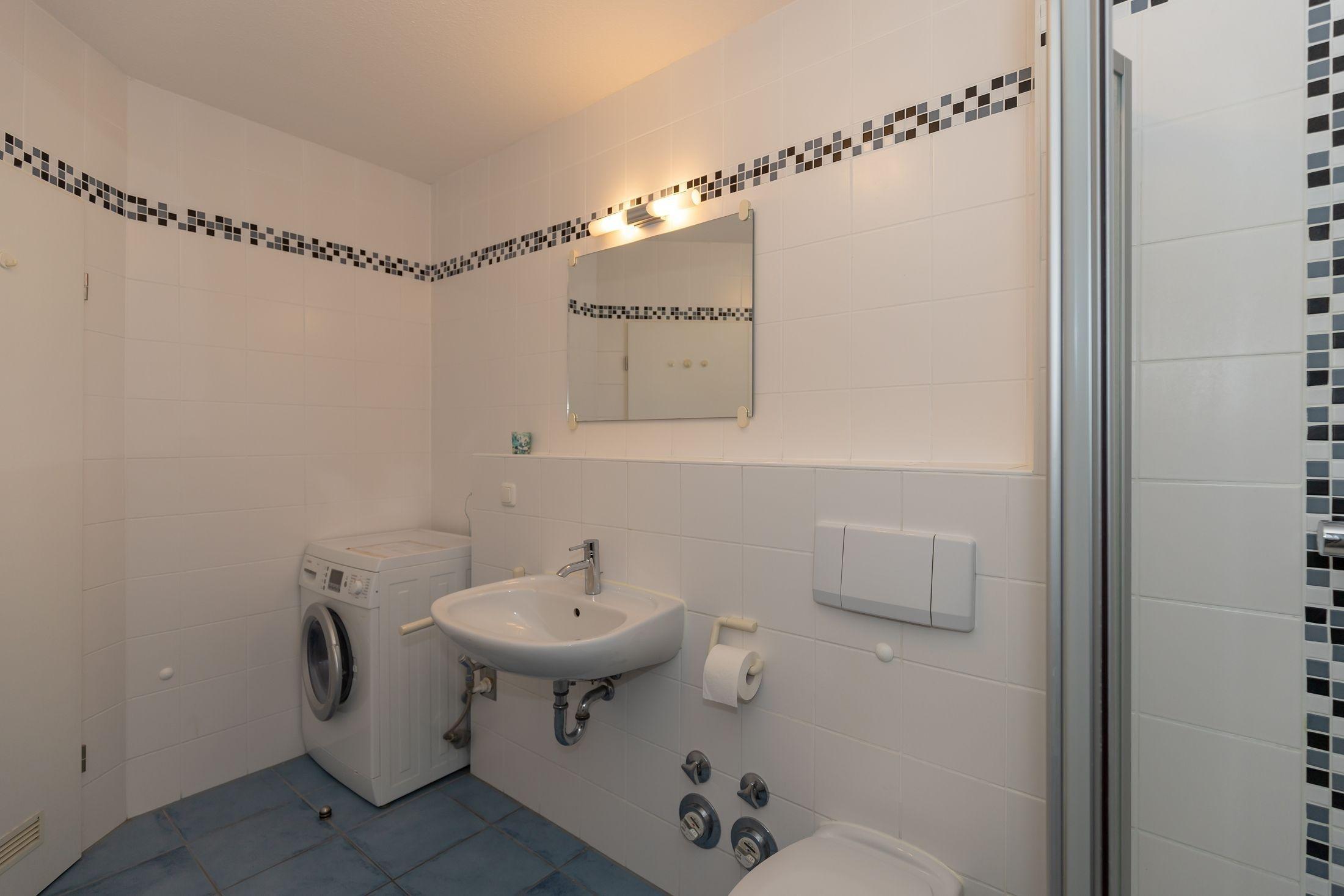 Das Badezimmer ist mit einer ebenerdigen Dusche, einem WC, einem Waschbecken, einem Handtuchheizkörper und einem Wäschetrockner ausgestattet.