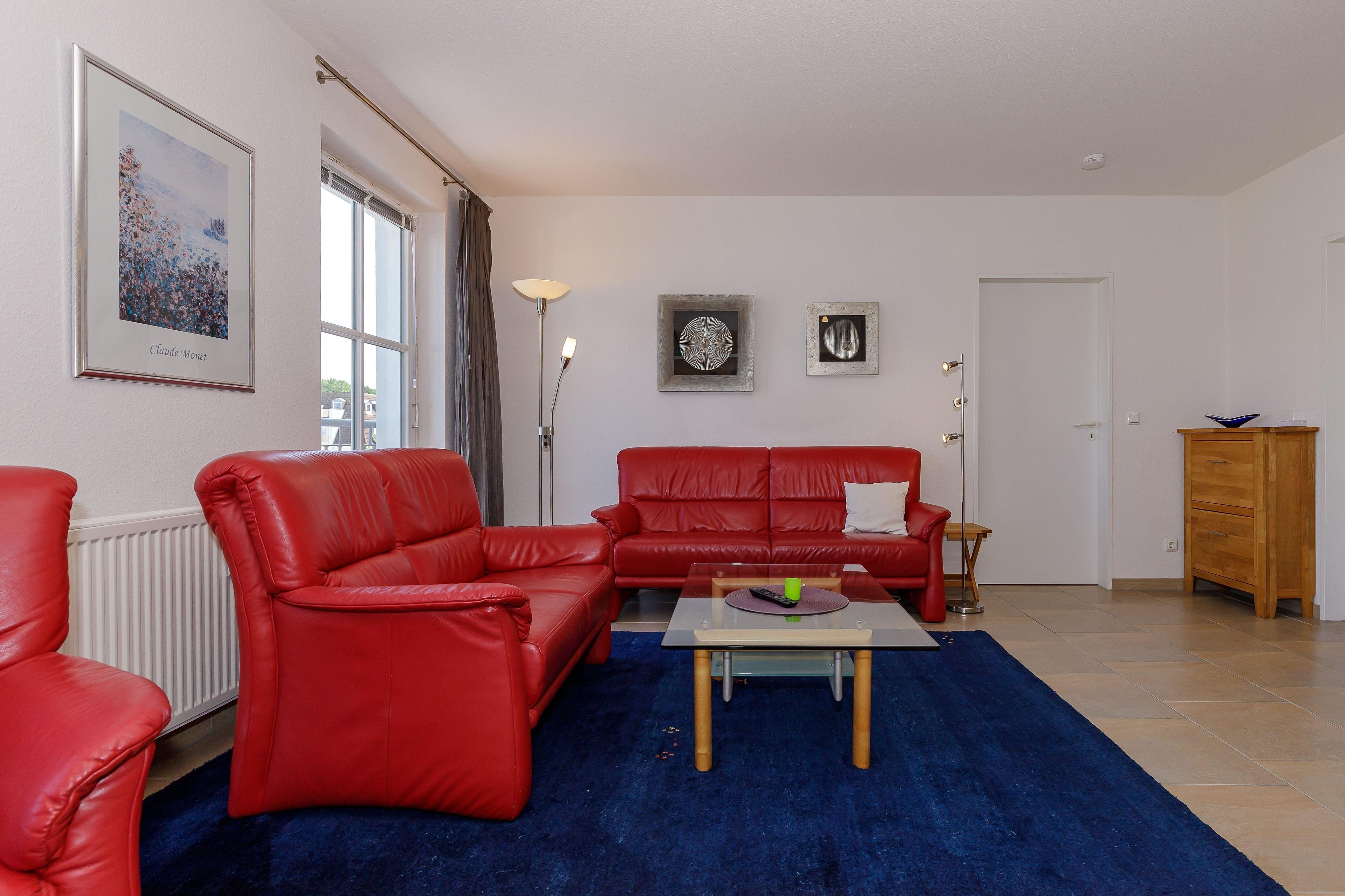 Der modern gestaltete Wohnbereich ist mit zwei bequemen Ledergarnituren und einem gemütlichen Sessel eingerichtet. Der ideale Ort für die Familie für gemeinsames Beisammensein. Für Ihre Unterhaltung sorgen ein LCD-TV sowie ein DVD-Player.
